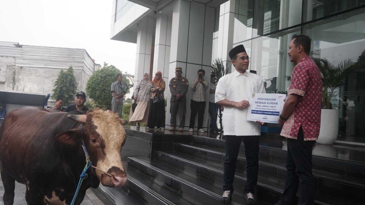 SinarHarapan.id – Chief Human Capital Officer ACC Fredericus Radix Wikanto (kiri) menyerahkan secara simbolis hewan kurban kepada Lurah Tanjung Barat Rizki Wijaya, di Kantor Pusat ACC Jalan TB Simatupang, Jakarta Selatan, Kamis (5/6/2025).