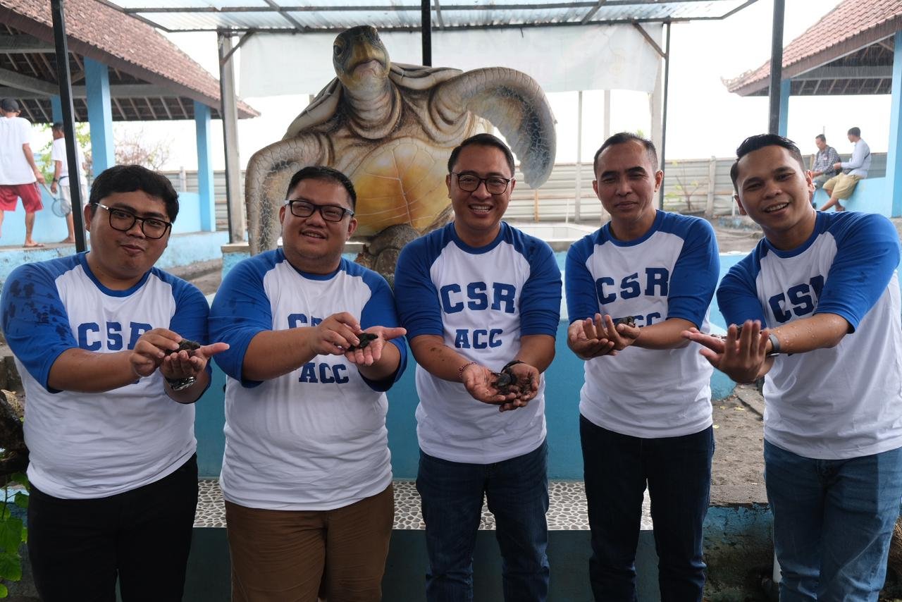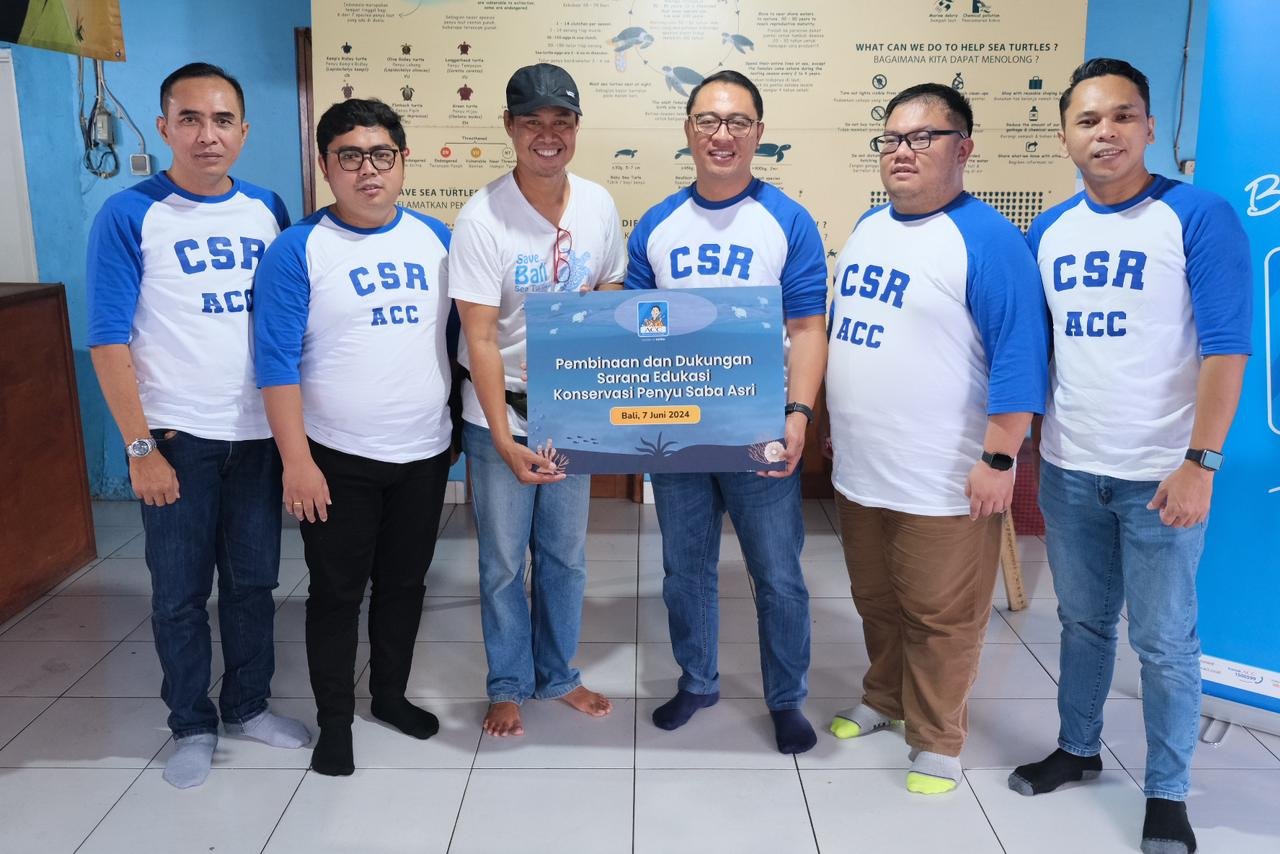 Branch Manager ACC Denpasar Ary Wiadnyana (ketiga dari kanan) didampingi ARManagement Head ACC Renon Dedi Hasiholan dan pejabat ACC Denpasar memberikan dukungan pembinaan dan sarana edukasi di Konservasi Penyu Saba Asri, Gianyar, Bali. Foto: SHID/Istimewa