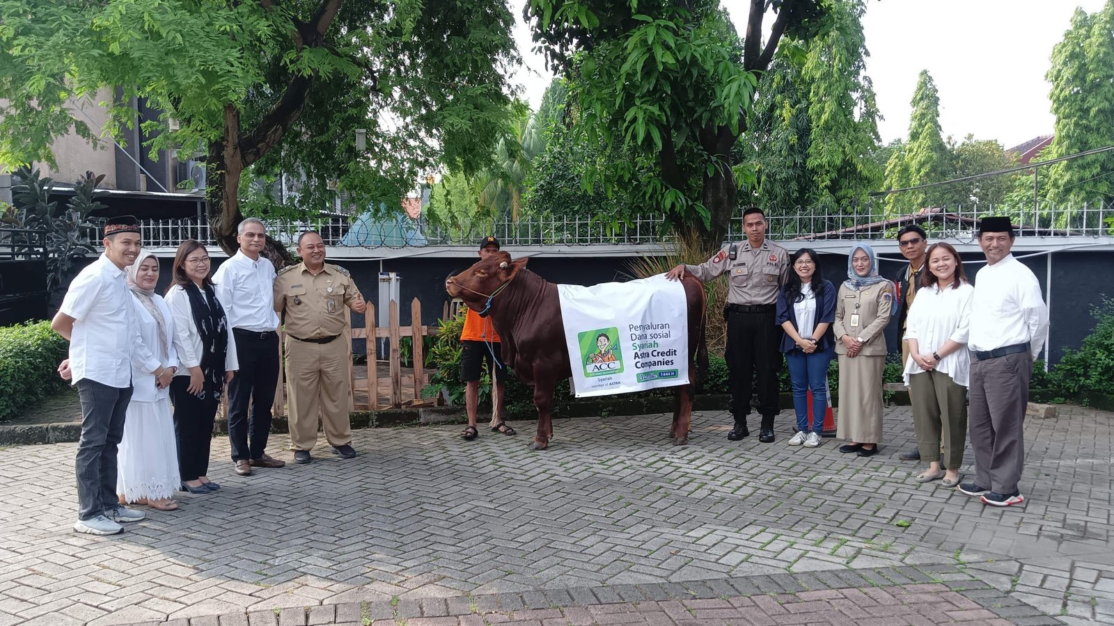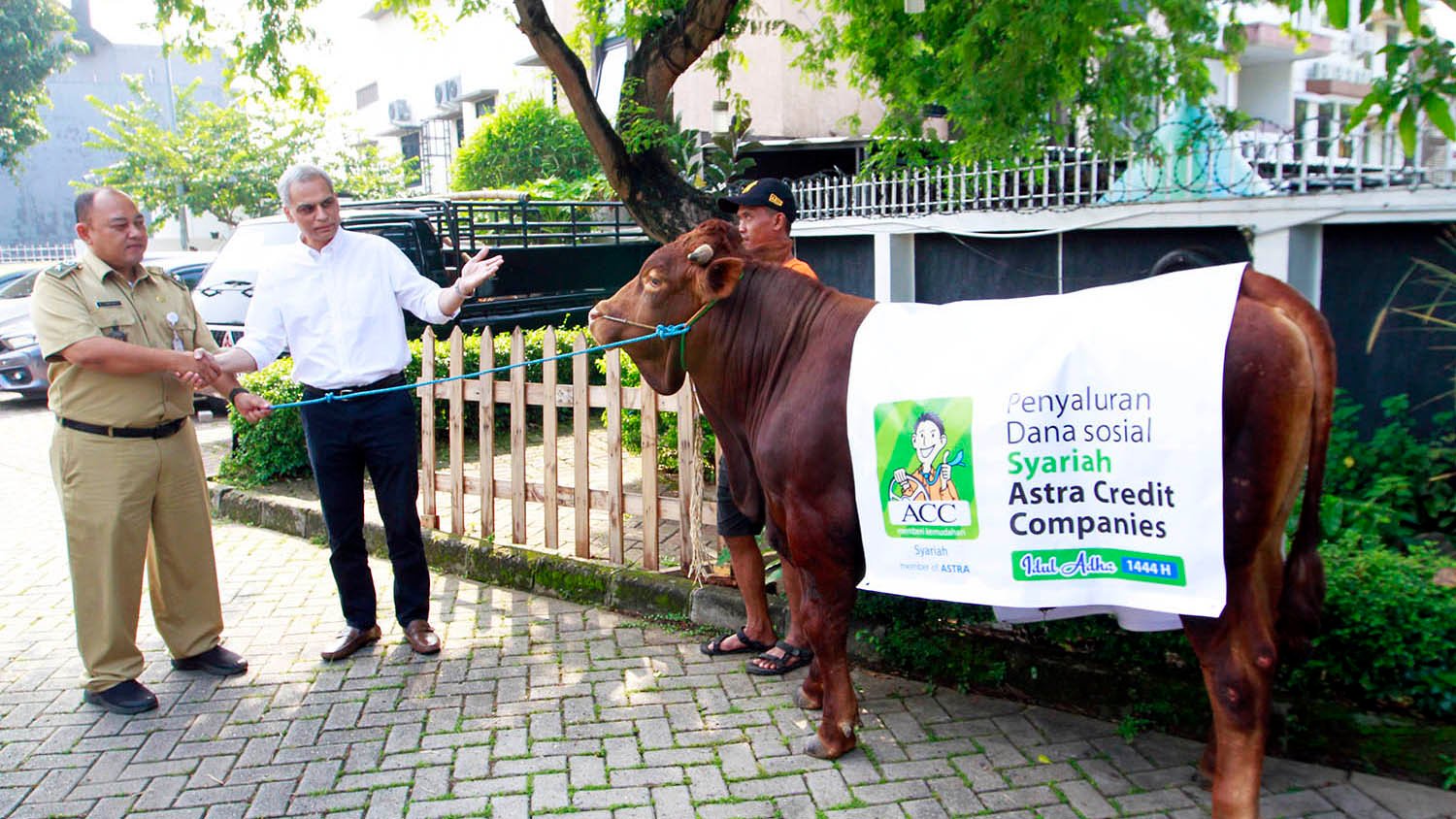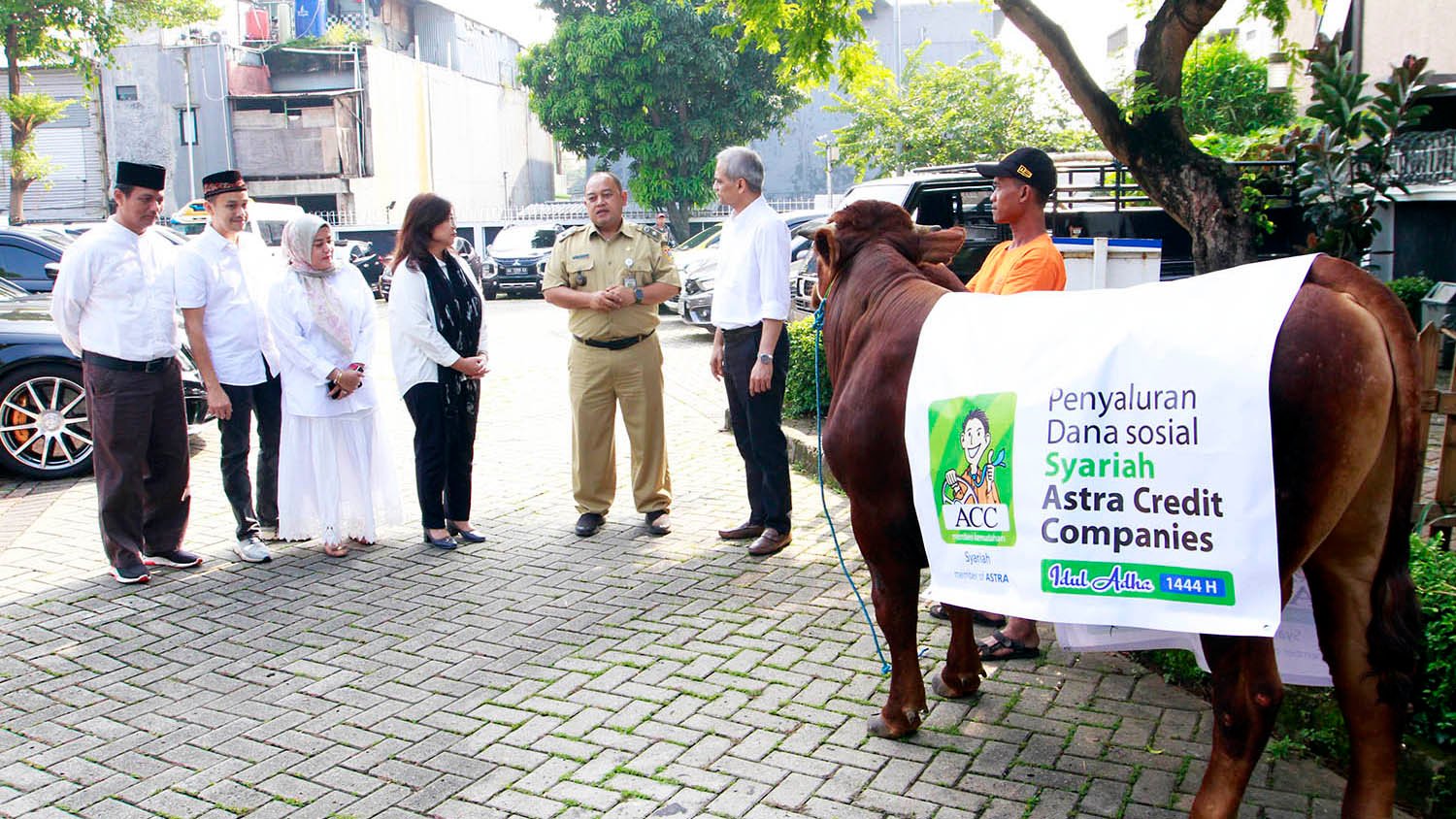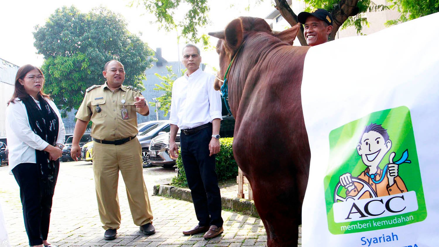 SinarHarapan.id – Unit Usaha Syariah Head ACC Wisnu Wardana, Corporate Compliance & Internal Audit Division Head Ronggur Saragih, Retention Business Division Head Vivi Elfira, Chief Human Capital Officer Matilda Esther, Lurah Tanjung Barat Ali Haryanto, Chief In Charge ACC Syariah Mohammad Farauk melakukan penyerahan hewan kurban secara simbolis di Kantor Pusat ACC Jakarta Selatan (26/6/2023). Menyambut Hari Raya Iduladha 1444 H Astra Credit Companies (ACC) menyalurkan sebanyak 1 ekor sapi limosin dan 153 ekor domba yang akan didistribusikan untuk masyarakat di sekitar kantor cabang ACC. Penyaluran hewan kurban ini mengatasnamakan 160 karyawan ACC (Mudhohi). Foto: SHID/Ruht Semiono