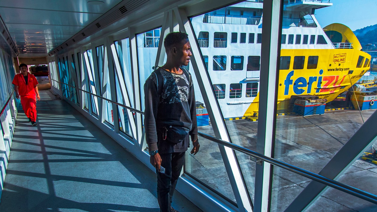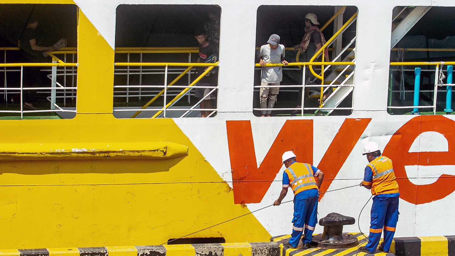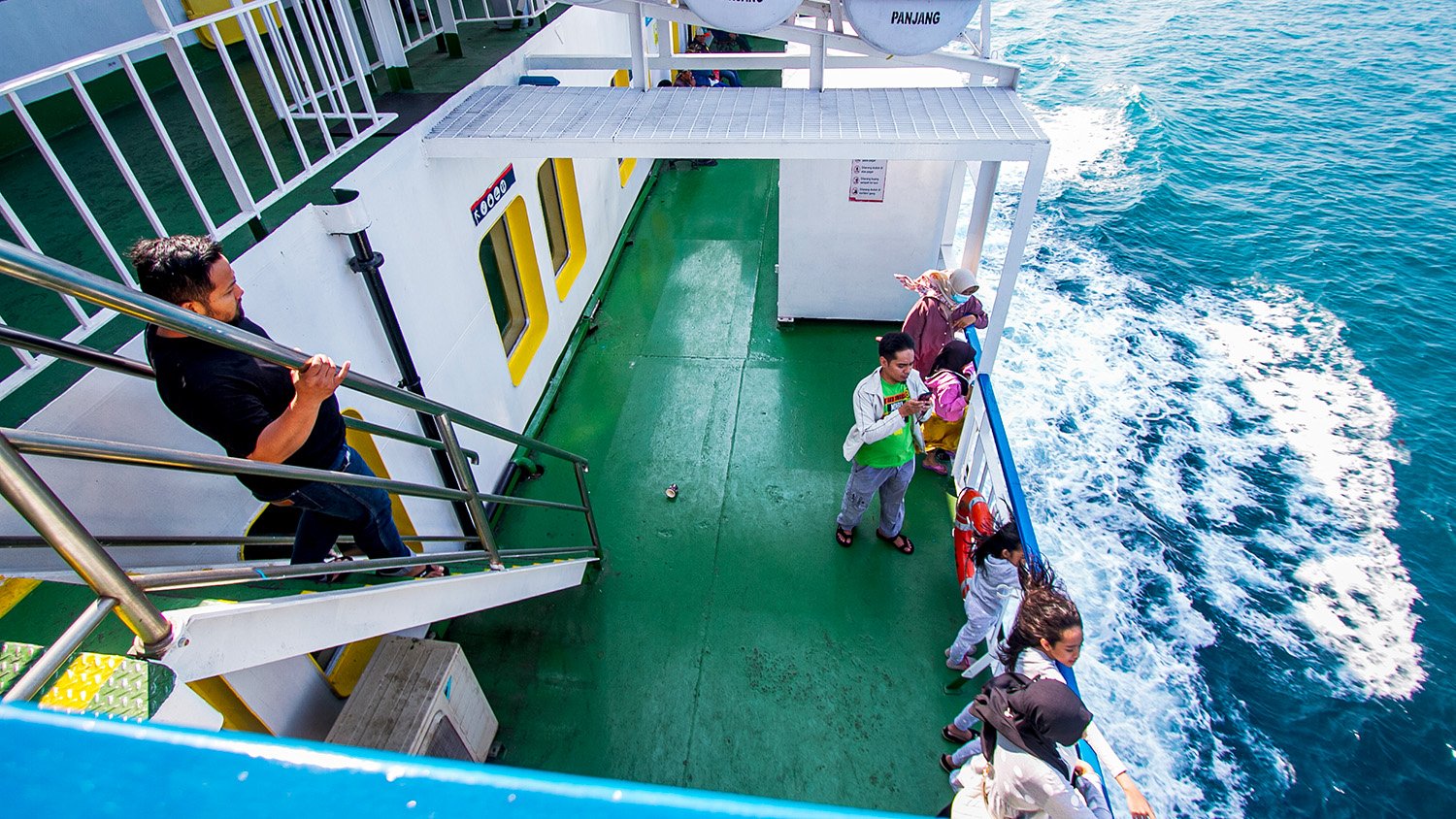 Pengguna jasa ASDP melihat pemandangan dari atas kapal.