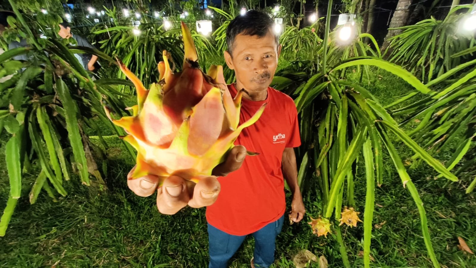 SinarHarapan.id – Petani Buah Naga binaan Astra melalui Yayasan Dharma Bhakti Astra (YDBA), Nanang Prasetyo (kiri) saat menyampaikan proses budidaya buah naga yang dijalankannya kepada Sekretaris Pengurus YDBA, Ema Poedjiwati Prasetio (kedua kanan); Bendahara Pengurus YDBA, Tarsisius Wijaya (kanan) dan Wakil Direktur Bidang Akademi dan Kerjasama Politeknik Pembangunan Pertanian Malang (Polbangtan Malang), Dr.Ir. Novita Dewi K., S.Pt., M.Si., IPU (kedua kiri) dalam kegiatan #AsikBersamaUMKM pekan lalu di Banyuwangi. Sejak tahun 2021 Astra melalui YDBA memperluas pembinaan di wilayah Banyuwangi, Jawa Timur yang salah satunya fokus pada pembinaan komoditas buah naga.