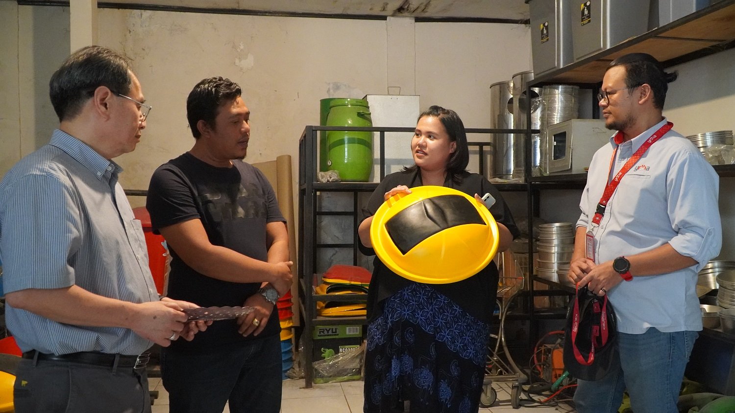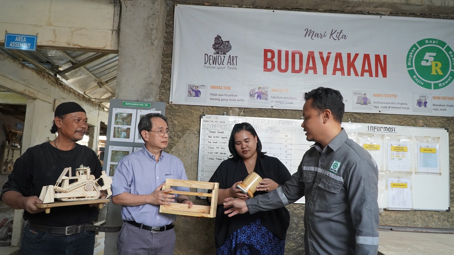 SinarHarapan.id – Pemilik UMKM binaan Astra melalui Yayasan Dharma Bhakti Astra (YDBA), Dewoz Art, Bayu Agusworo (kanan) dan Suwarto (kiri) saat menunjukkan produk hasil buatannya kepada Ketua Pengurus YDBA, Sigit P. Kumala (kedua kiri) dan SMEs Coordinator IKEA Indonesia, Rimaditya Prameswari (kedua kanan) dalam kegaiatan #AsikBersamaUMKM di Tarikolot Bogor pekan lalu. #AsikBersamaUMKM merupakan salah satu kegiatan YDBA yang bertujuan untuk memperkenalkan UMKM kepada stakeholder sekaligus mengajak stakeholder tersebut untuk berkolaborasi baik sebagai Ayah Angkat maupun Offtaker bagi UMKM binaan YDBA. Selain itu Ketua Pengurus Yayasan Dharma Bhakti Astra (YDBA), Sigit P. Kumala juga mengunjungi UMKM binaan Astra melalui YDBA lainya yakni CV Harapan Mandiri dengan material limbah plastik yang di-recycle menjadi produk atau komponen alat rumah tangga. Foto: SHID/Ruht Semiono