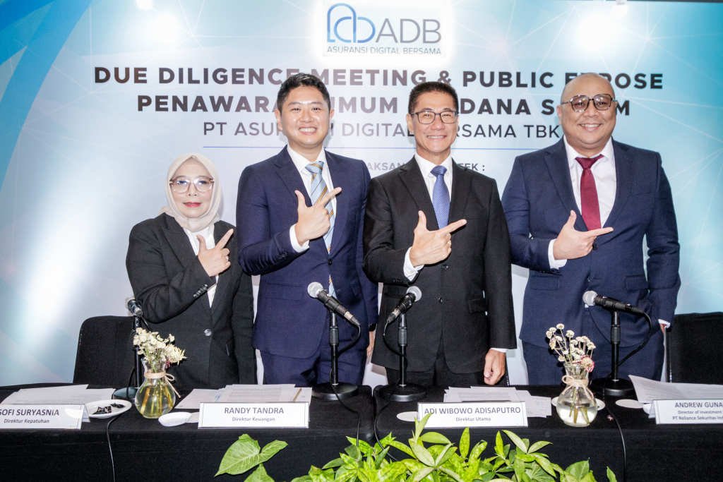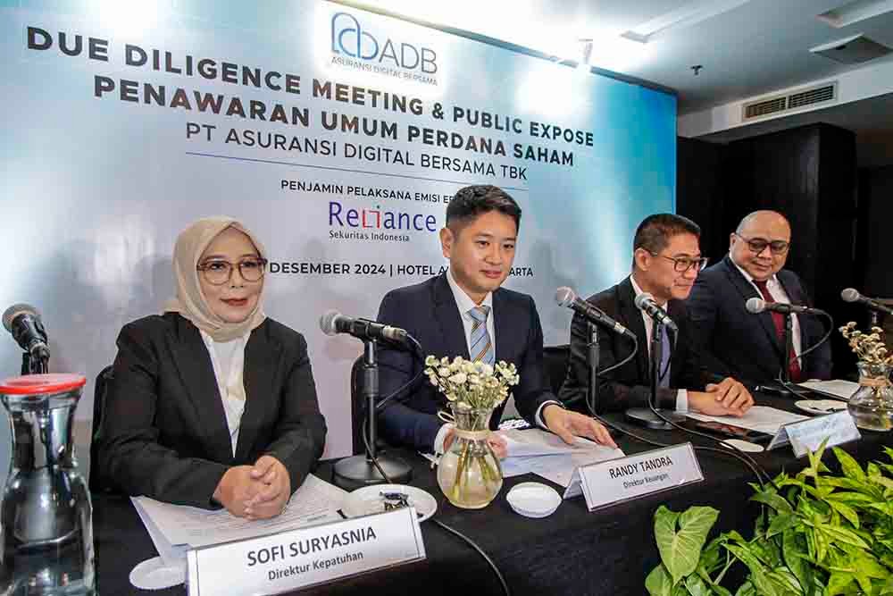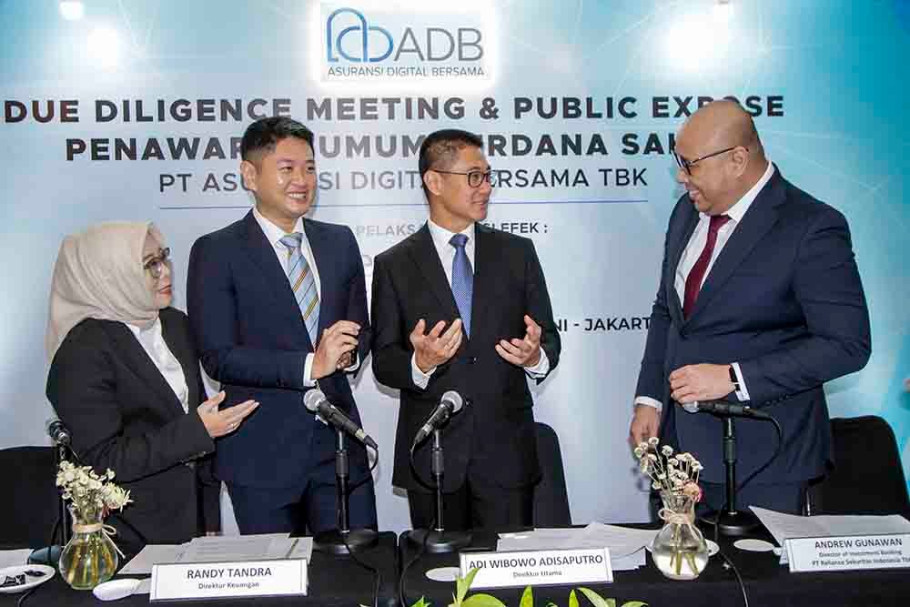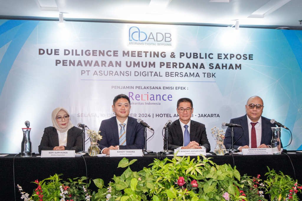 SinarHarapan.id – Dari kiri ke kanan Sofi Suryasnia Direktur Kepatuhan PT Asuransi Digital Bersama Tbk, Randy Tandra Direktur Keuangan PT Asuransi Digital Bersama Tbk, Adi Wibowo Adisaputro Direktur Utama PT Asuransi Digital Bersama Tbk dan Andrew Gunawan -Director of Investment Banking PT Reliance Sekuritas Indonesia Tbk pada acara Press Conference Penawaran Umum Perdana Saham PT Asuransi Digital Bersama Tbk di Jakarta, Selasa (10/12/2024).