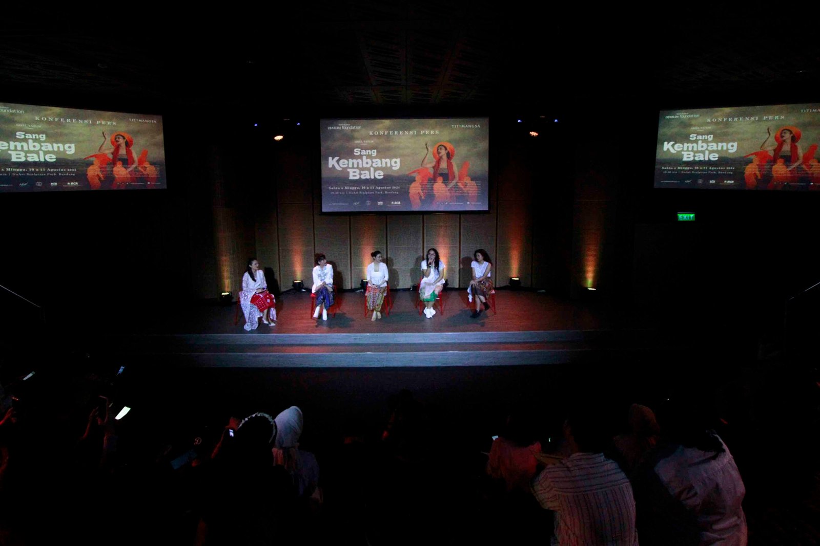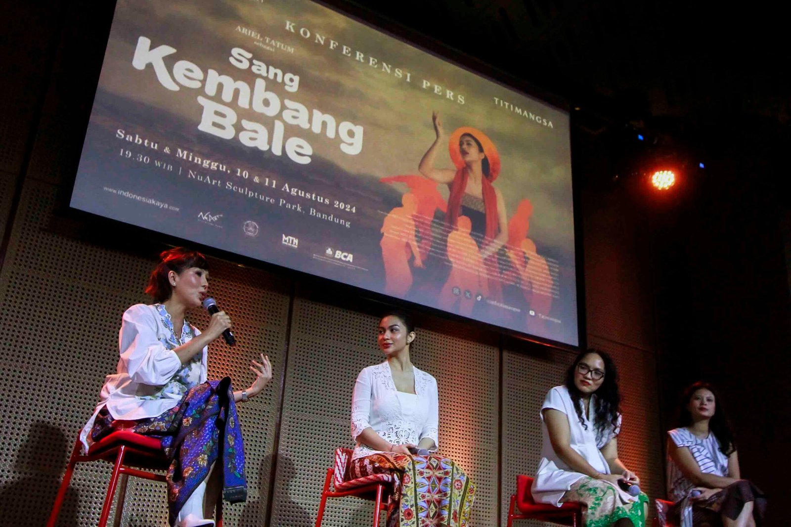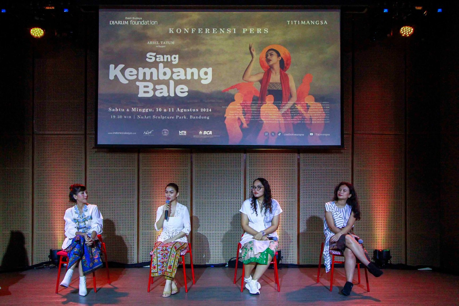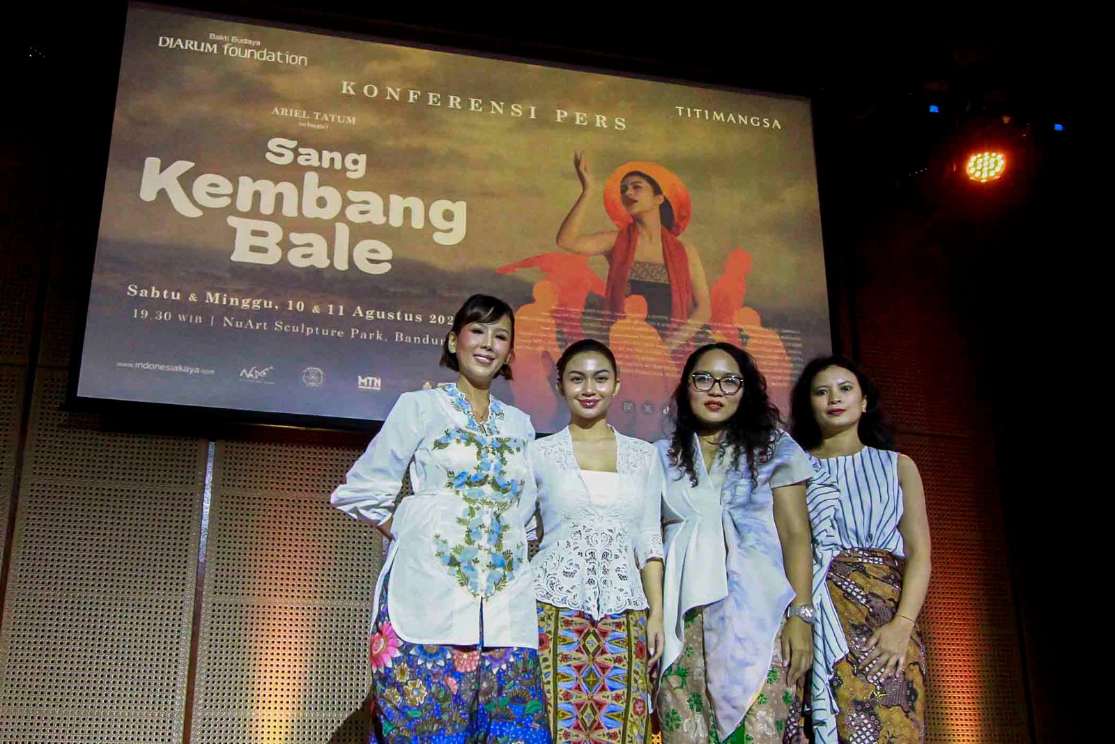 SinarHarapan.id – Program Director Bakti Budaya Djarum Foundation Renitasari Adrian (kiri) Bersama Pemeran Sang Kembang Bale Ariel Tatum (kedua kiri), Produser Pradetya Novitri (kedua kanan), dan Sutradara Heliana Sinaga (kanan) memberikan keterangan pers jelang pementasan Sang Kembang Bale di Galeri Indonesia Kaya, Jakarta, Kamis (1/8/2024). Titimangsa bersama Bakti Budaya Djarum Foundation akan mengadakan pementasan Sang Kembang Bale (Nyanyian yang Kutitipkan pada Angin) pada 10-11 Agustus 2024 mendatang di NuArt Sculpture Park, Bandung. Foto: SHID/Ruht Semiono