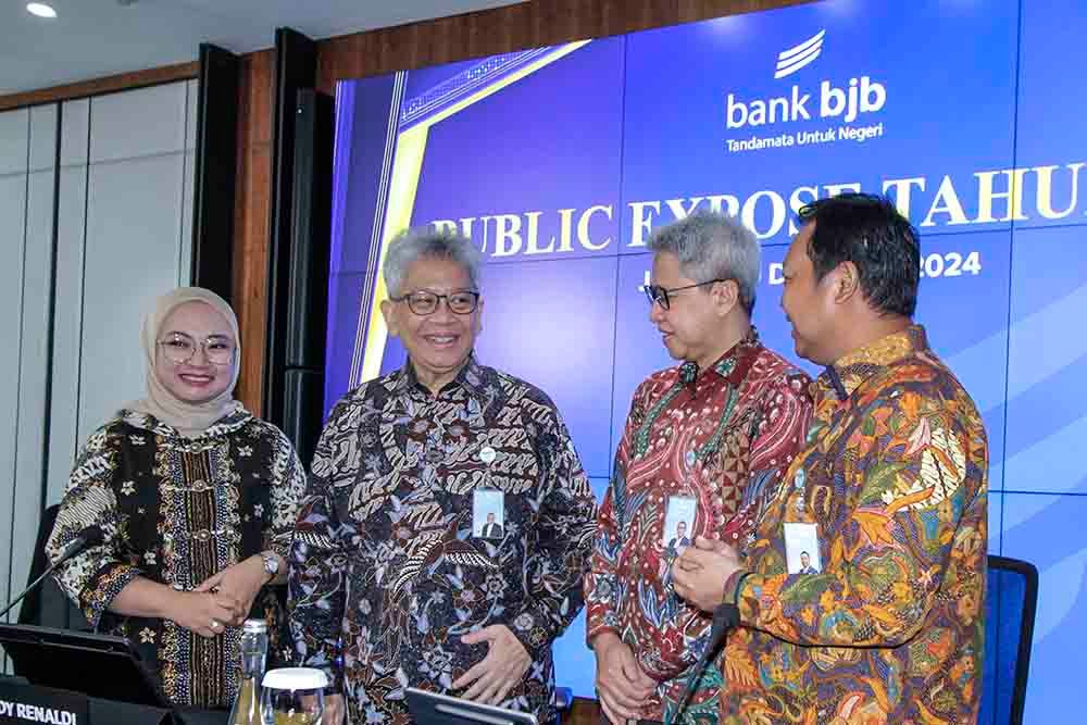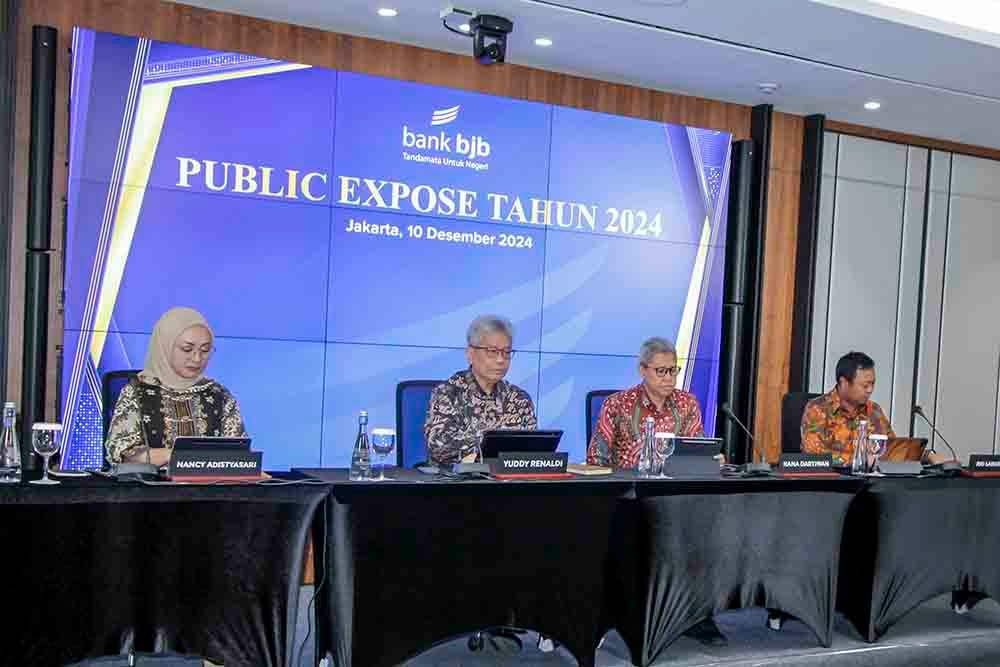 SinarHarapan.id – Dari kiri ke kanan Direktur Komersial dan UMKM Bank bjb Nancy Adistyasari, Direktur Utama Bank bjb Yuddy Renaldi, Direktur Keuangan Bank bjb Hana Dartiwan, Direktur IT dan Transaction Banking Rio Lanasier pada acara Public ekspose Bank BJB tahun 2024 di Jakarta, Selasa (10/12/2024). Bank bjb mencatatkan kinerja dan pertumbuhan bisnis yang solid sepanjang tahun 2024. Di tengah tantangan ekonomi nasional dan global, bank bjb menunjukkan kinerja berkelanjutan yang solid. Direktur Utama bank bjb, Yuddy Renaldi, dalam Public Expose 2024, menyatakan bahwa keberhasilan tersebut tidak terlepas dari inovasi layanan perbankan, diversifikasi bisnis, serta pengelolaan risiko yang matang.