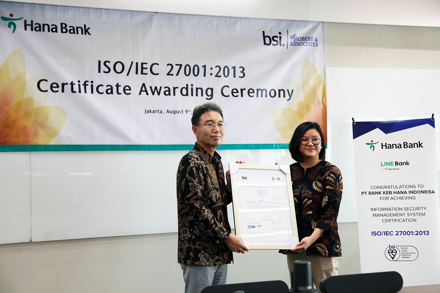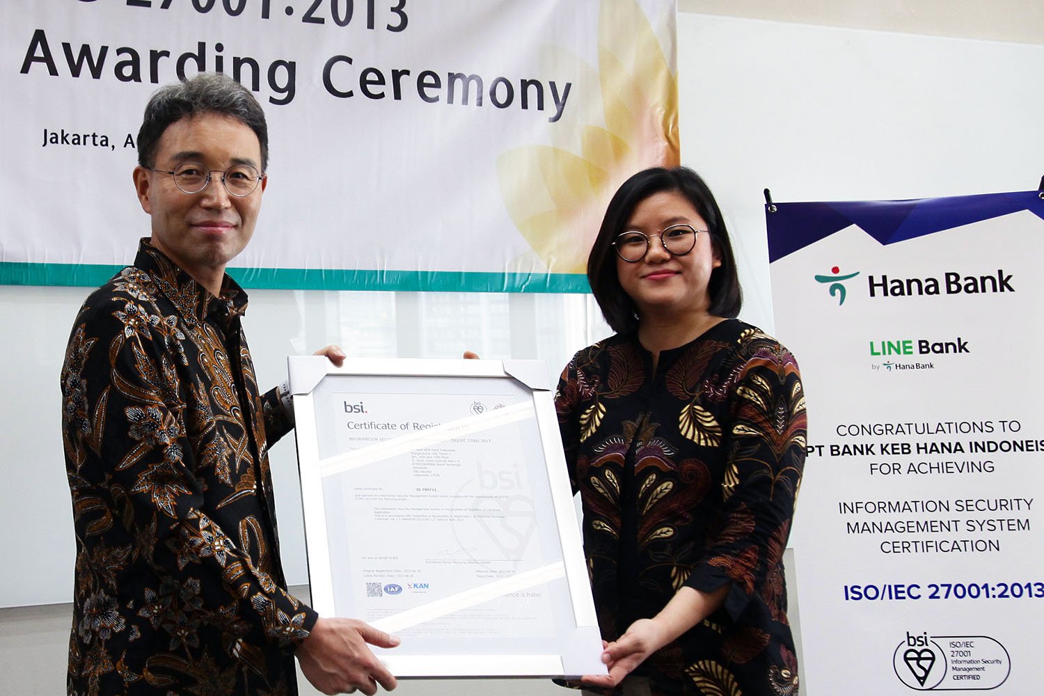 “Peraihan sertifikasi ISO 27001 ini merupakan wujud nyata komitmen Bank Hana yang secara berkesinambungan terus meningkatkan keamanan sistem informasi layanan perbankan bagi para Nasabah,” tutur Direktur Utama Bank Hana Park Jong Jin di sela-sela acara.