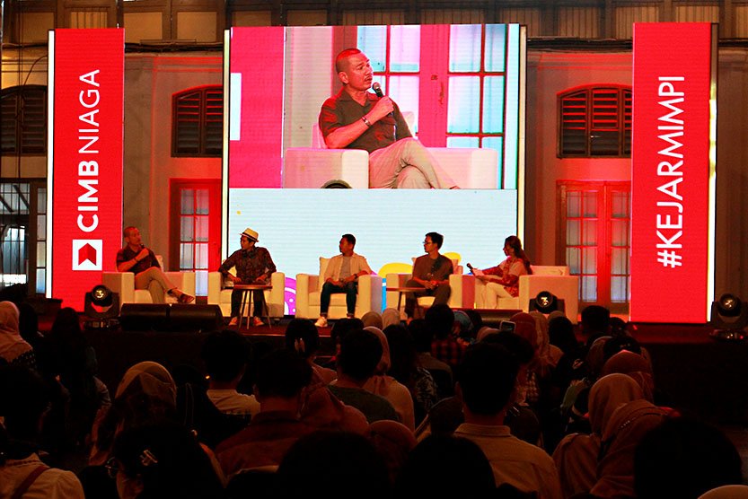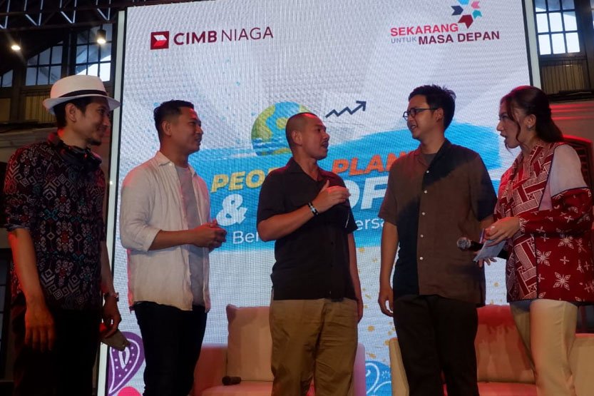 SinarHarapan.id – Brand Strategy & Experience Head CIMB Niaga Muhamad Firdaus Andjar (tengah) berbincang bersama Founder & CEO Waste4Change M. Bijaksana Junerosano (kiri), Founder & CEO Rappo Upcycle Akmal Idrus (kedua kiri), dan Founder By Binzu Bintang Aziizu (kedua kanan) usai sesi talkshow Kejar Mimpi Actionation bertema ‘People, Planet, & Profit Bertumbuh Bersama’ di Pos Bloc Jakarta, Sabtu (19/11/2022). Melalui acara ini, CIMB Niaga mendukung para pelaku UKM dan brand lokal yang menerapkan prinsip sustainability dengan memberikan pembekalan edukasi dan kesempatan untuk menampilkan serta menjual produk unggulannya sehingga makin dikenal oleh masyarakat. Festival penuh inspirasi ini juga menampilkan peragaan busana hingga konser KAHITNA. Foto: SH/Ruht Semiono