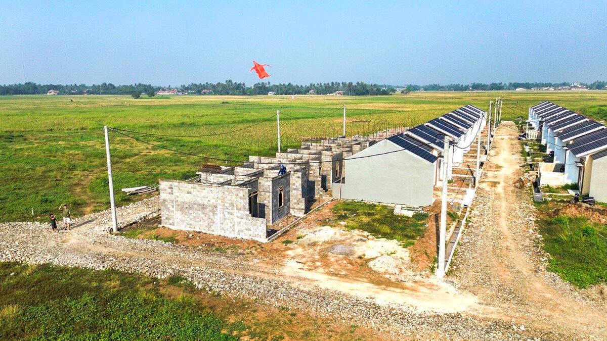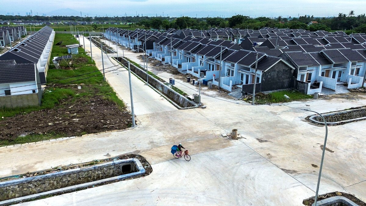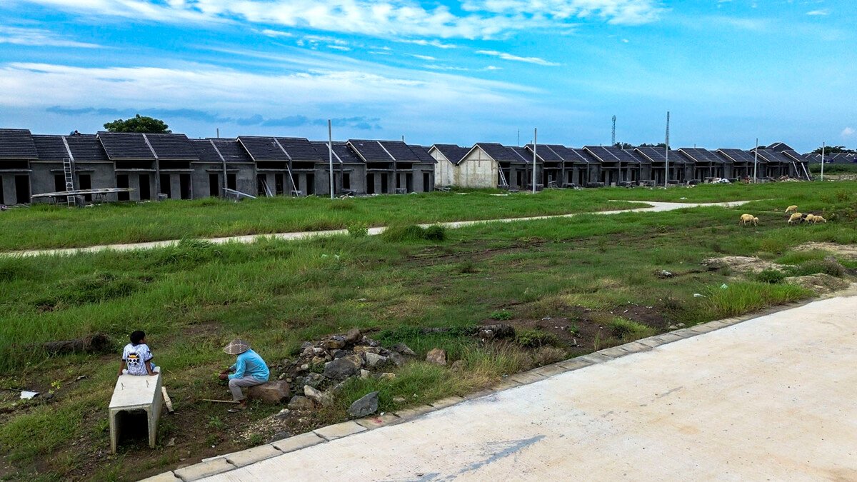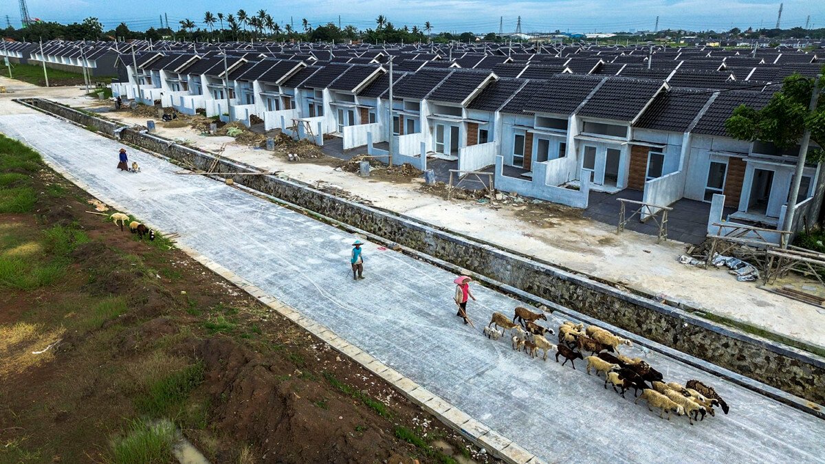 Pengendara motor melintas di antara proyek pembangunan rumah subsidi di Kabupaten Tangerang, Banten, Jumat (20/2/2026).