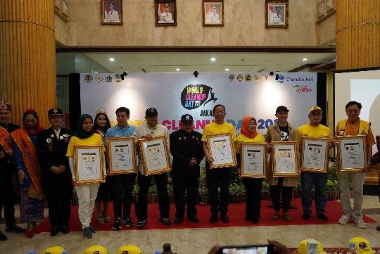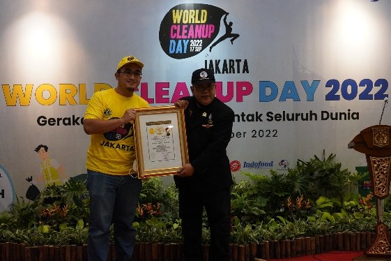 SinarHarapan.id- Presiden Original Rekor Indonesia (ORI) Guruh Susanto (kanan) menyerahkan piagam rekor kepada Circular Economy Sr. Specialist PT Chandra Asri Petrochemical Tbk (Chandra Asri), Nicko Setyabudi (kiri) pada acara World Cleanup Day (WCD) 2022 yang diselenggarakan oleh Lions Club dengan tema Pilah Sampah Dari Rumah di Jakarta, Sabtu (17/9). Chandra Asri kembali mendukung program WCD Jakarta yang bertujuan untuk mengedukasi masyarakat menangani masalah sampah rumah tangga di Indonesia. Program ini diadakan di 600 lokasi di wilayah DKI Jakarta diikuti oleh 199.363 peserta dengan jumlah sampah yang berhasil terkumpul sebanyak 247.938 ton. SH/Andrey