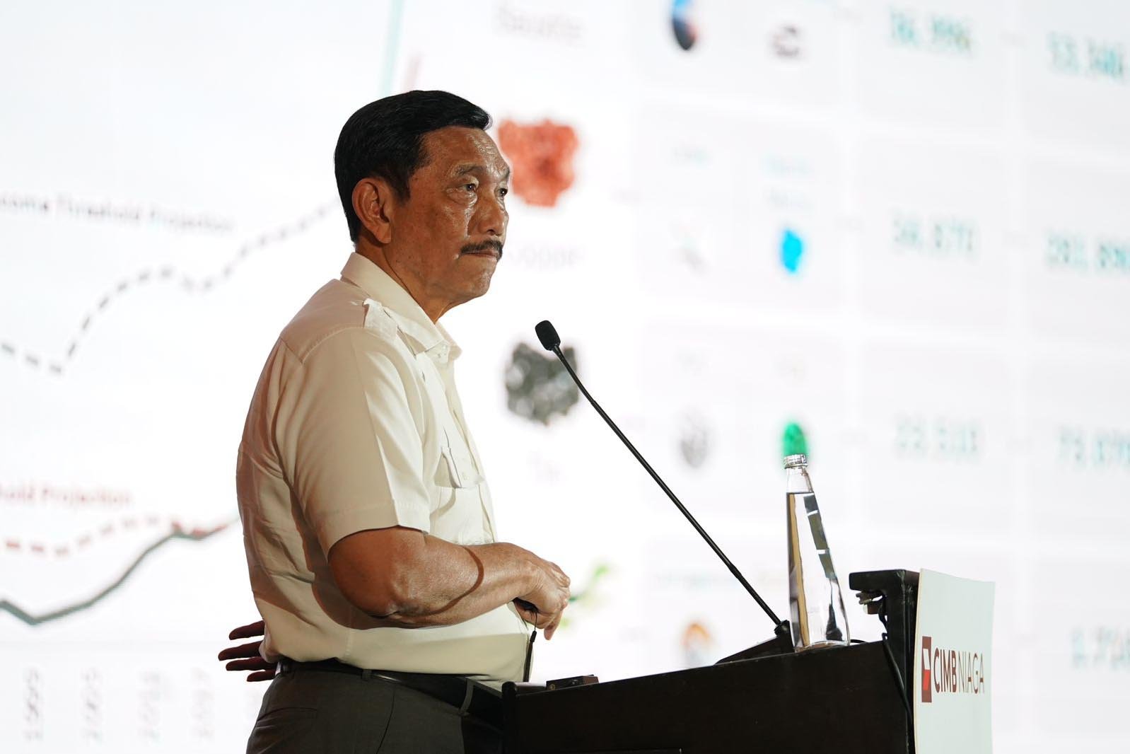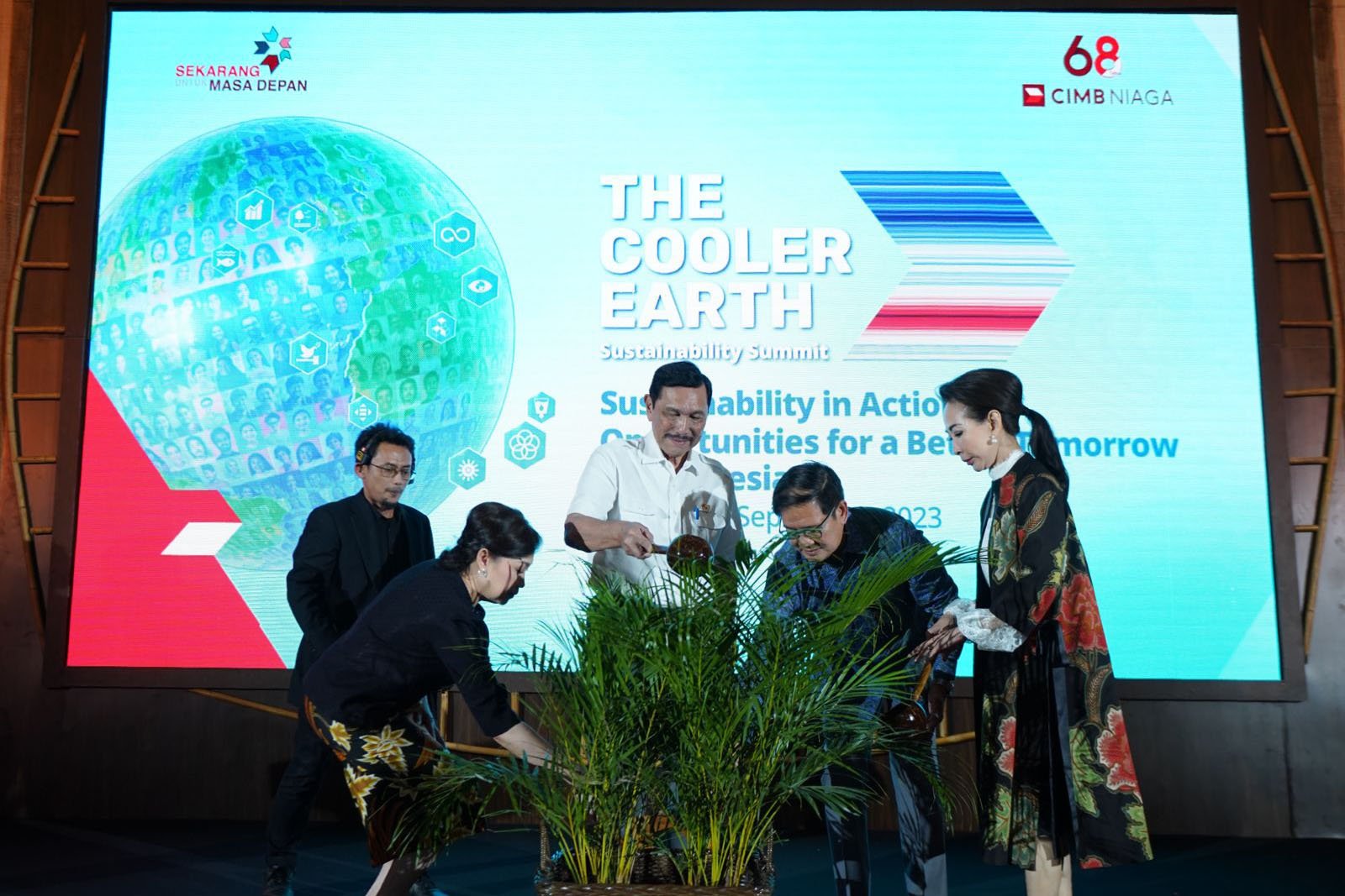 SinarHarapan.id – Menteri Koordinator Bidang Kemaritiman dan Investasi Republik Indonesia Luhut Binsar Pandjaitan (kedua kiri) bersama Presiden Direktur CIMB Niaga Lani Darmawan (kiri), Presiden Komisaris CIMB Niaga Didi Syafruddin Yahya (kedua kanan), dan Direktur Compliance, Corporate Affairs & Legal CIMB Niaga Fransiska Oei (kanan) menyiram tanaman sebagai tanda telah berlangsungnya The Cooler Earth Sustainability Summit 2023 bertema “Sustainability in Action: Opportunities for a Better Tomorrow in Indonesia” di Jakarta, Rabu (13/9/2023). Sejak 2019, The Cooler Earth Sustainability Summit hadir sebagai misi CIMB Niaga untuk memobilisasi komitmen dan tindakan kolektif untuk membentuk masyarakat yang bertanggung jawab dan planet yang lebih layak huni. Acara ini juga merupakan wujud dukungan nyata CIMB Niaga terhadap program pemerintah dalam mengatasi perubahan iklim dan mencapai Net Zero Emission pada tahun 2060. Foto: SHID/Ruht Semiono