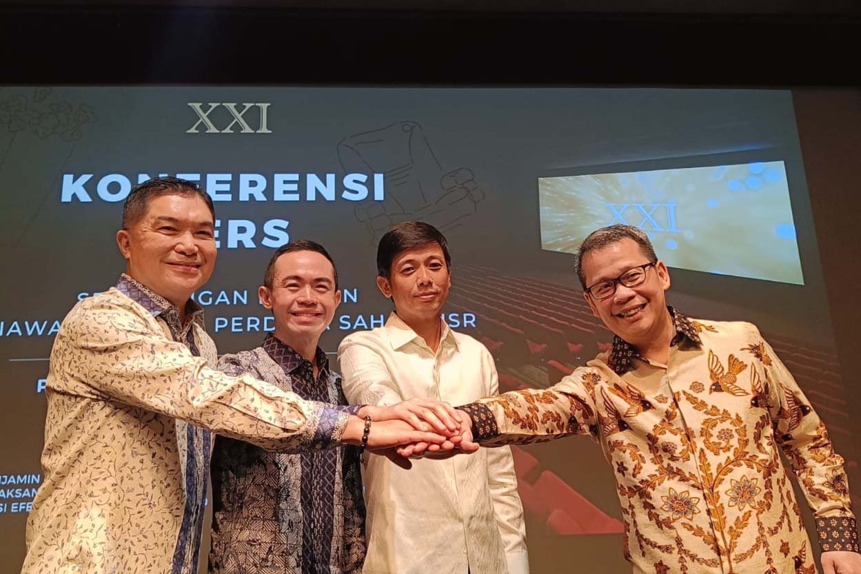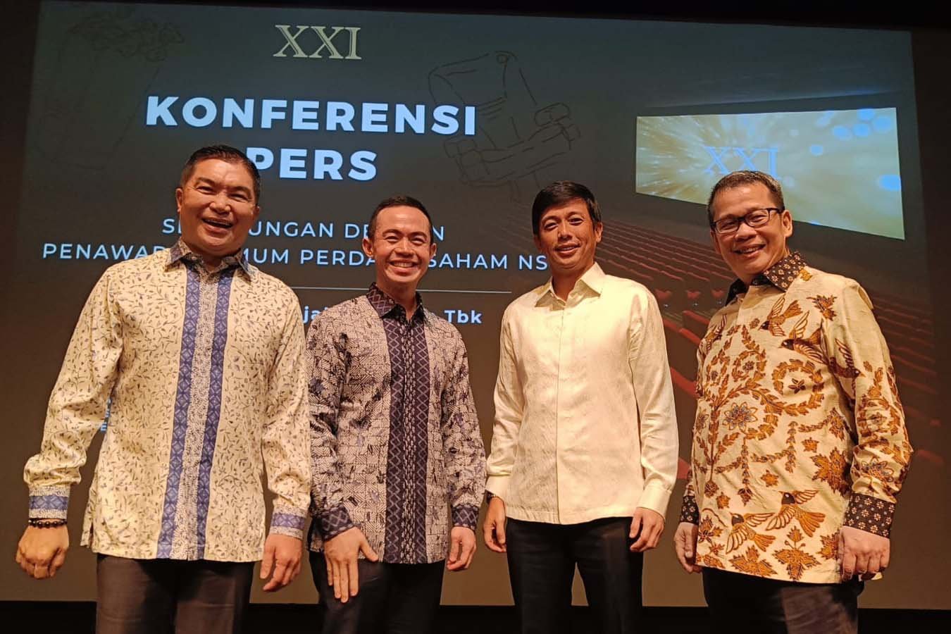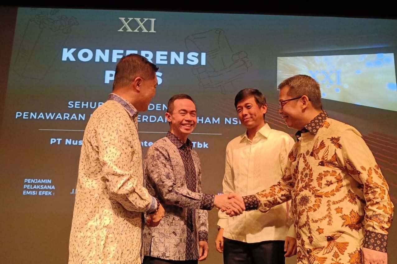 SinarHarapan.id – Jajaran direksi PT Nusantara Sejahtera Raya Tbk (dari kiri ke kanan) Direktur PT Nusantara Sejahtera Raya Tbk Dody Suhartono, Direktur PT Nusantara Sejahtera Raya Tbk Arif Suherman, Direktur Utama PT Nusantara Sejahtera Raya Tbk Hans Gunadi dan Direktur PT Nusantara Sejahtera Raya Tbk Tri Rudy Anitio bebincang disela acara Konferensi pers di Plaza Senayan, Jakarta, Jumat (7/7/2023). PT Nusantara Sejahtera Raya Tbk siap melenggang ke Bursa Efek Indonesia via penawaran umum saham perdana alias Initial Public Offering (IPO). Cinema XXI akan menawarkan sebanyak-banyaknya 8,33 miliar saham dengan nominal Rp 8 per saham. Ini setara dengan 10% dari modal ditempatkan dan disetor usai IPO.