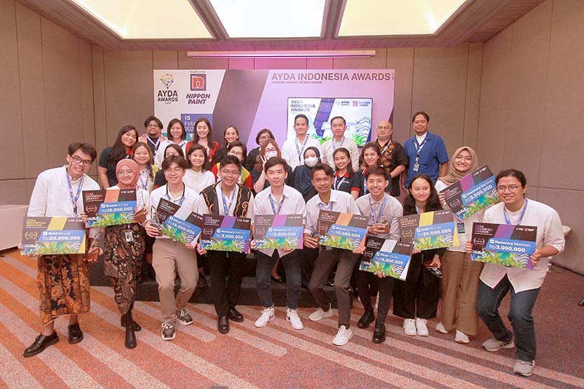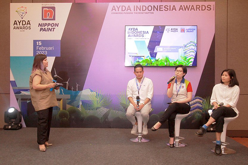 SinarHarapan.id – Marketing Manager Nippon Paint Indonesia Linda Kam (tengah) besama Salsabila Novitasari dari Universitas Gadjah Mada dengan karya “Re-Stack!” pemenang Gold Winner kategori Arsitektur (kiri) dan Arya Putra dari Institut Teknologi Bandung dengan karya “Silih Hub” untuk kategori Desain Interior pada acara Grand Final AYDA Indonesia Awards 2022/23, yang berlangsung di Hotel Ibis Style Jakarta Pusat, Rabu (15/2/2023). Nippon Paint secara konsisten juga terus berkomitmen dalam mendukung dunia arsitektur dan desain interior melalui ajang “Asia Young Designer Awards” yang telah berlangsung sejak 2008 dengan tujuan untuk mengembangkan talenta dari mahasiswa/i Arsitektur dan Desain Interior. Kompetisi AYDA Indonesia Awards 2022/23 kali ini mengambil tema Converge: Pushing The Reset Button. Foto: SHID/Ruht Semiono