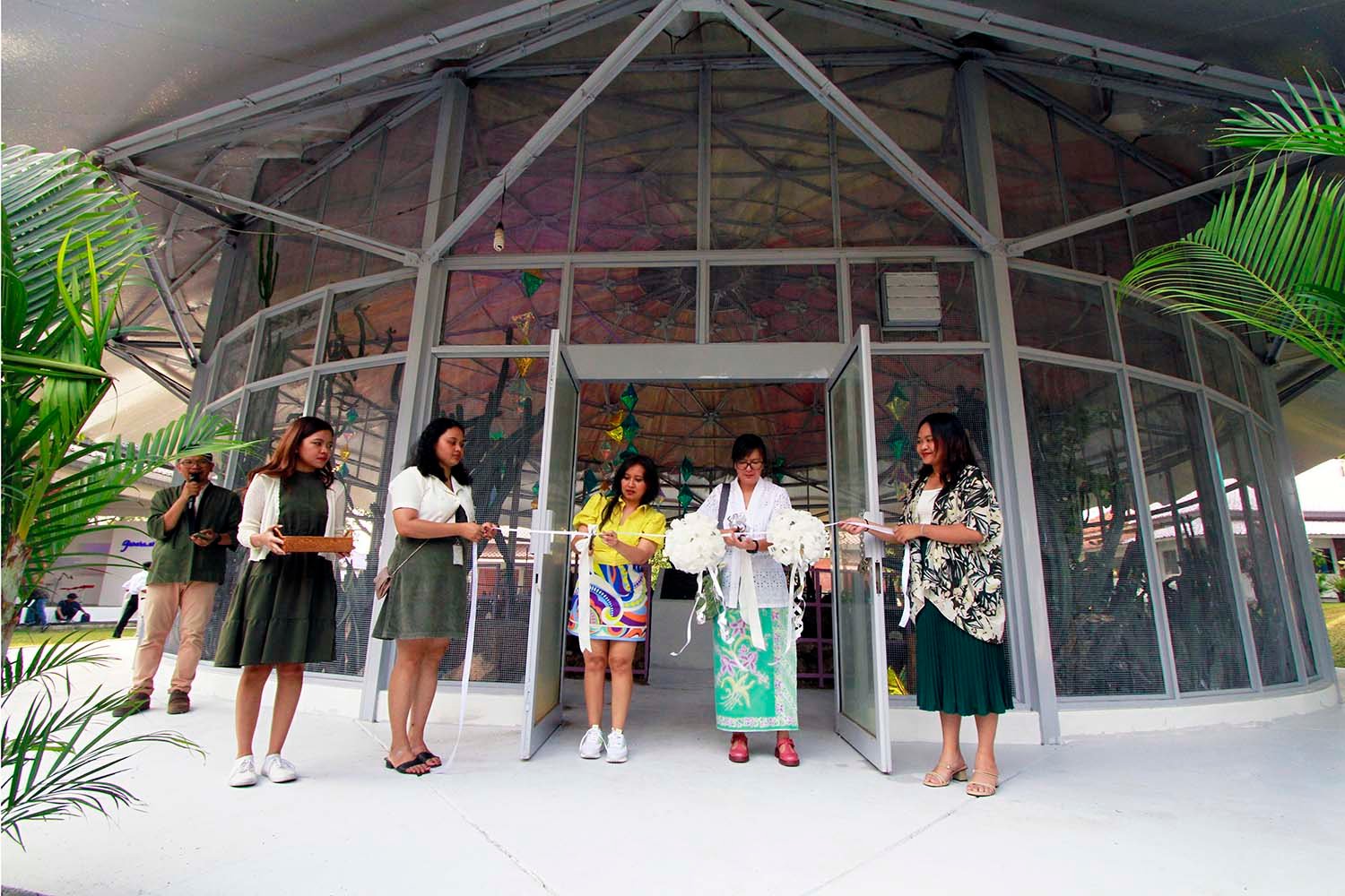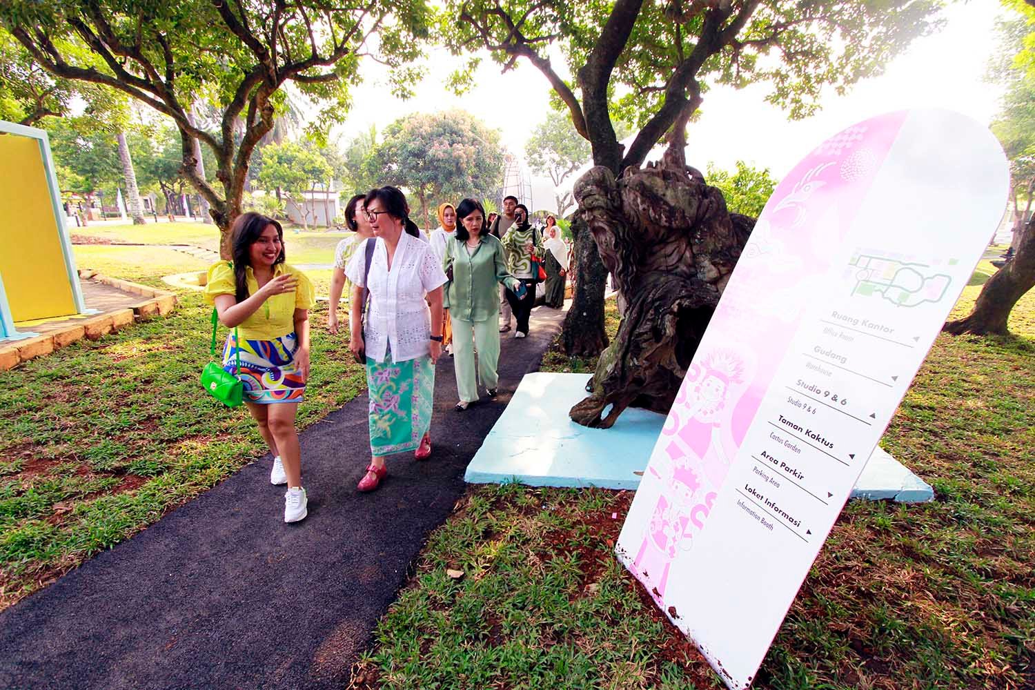 SinarHarapan.id – Founder dan CEO Ganara Art Tita Djumaryo bersama Direktur Utama PT Bhumi Visatanda Indonesia selaku pengelola TMII Claudia Ingkiriwang saat meresmikan Desa Seni Ganara menjelang perayaan Hari Ulang Tahun Ke-78 Kemerdekaan Indonesia, dan menjadi taman seni terbesar di Jakarta yang terbentang lebih dari 10,000 m2 di Taman Mini Indonesia Indah, Jakarta, Senin (14/8/2023).