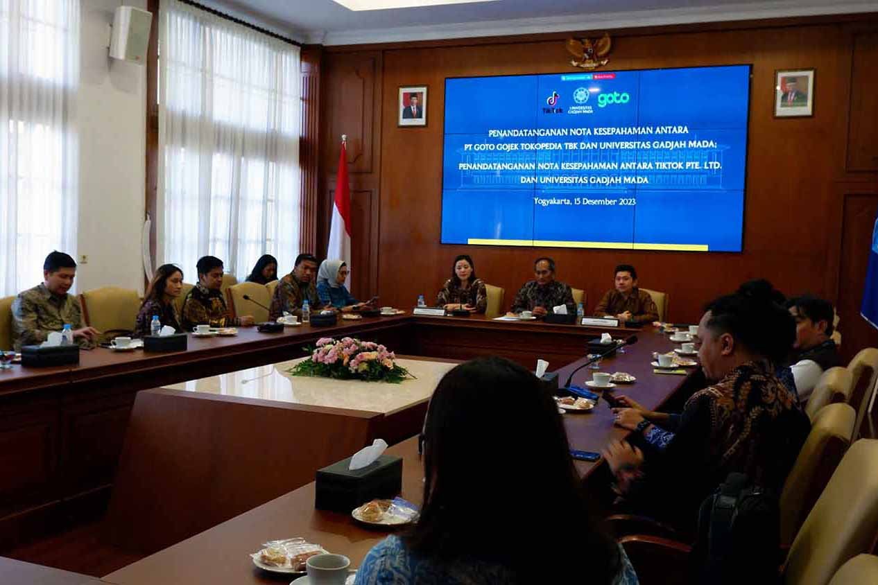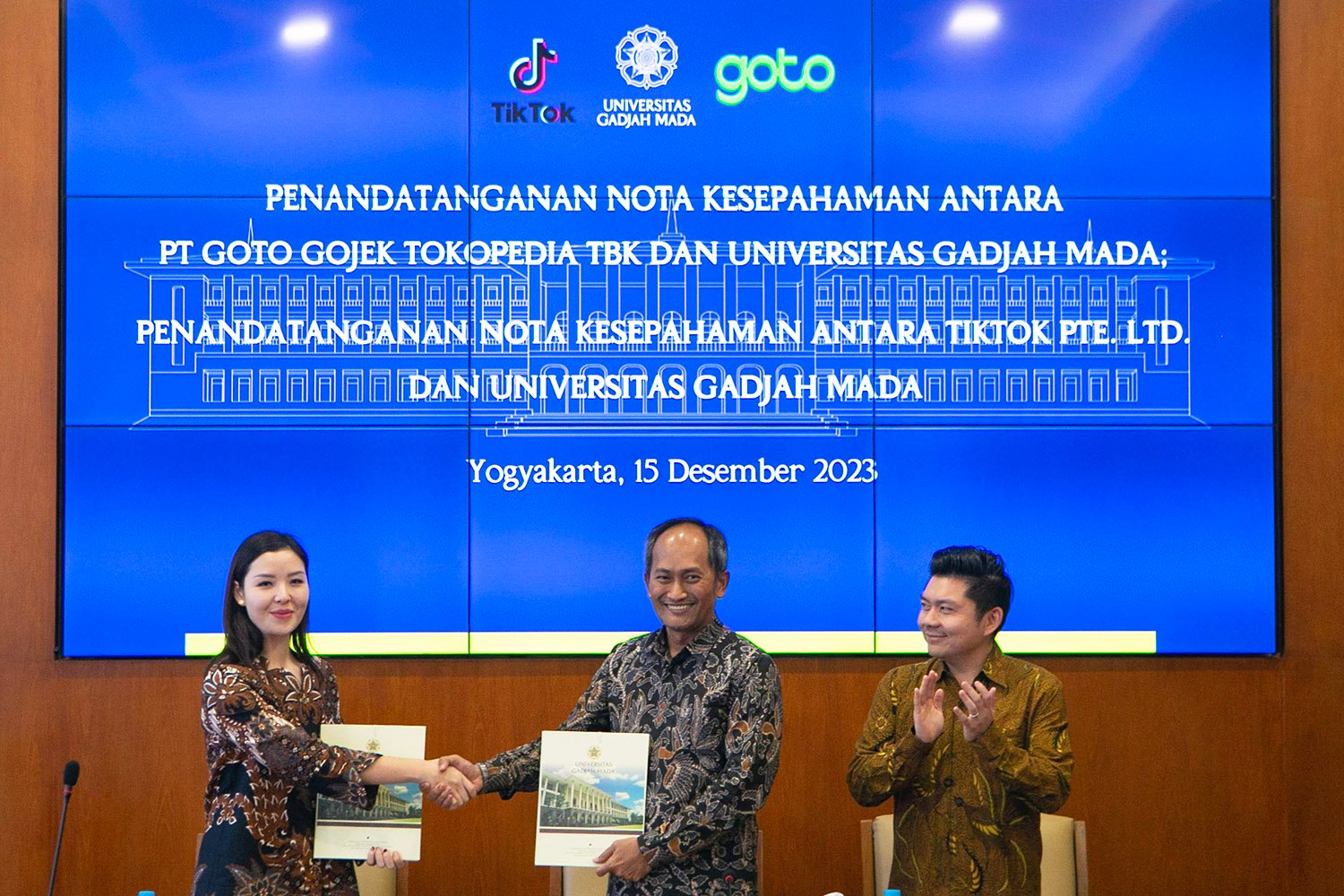 SinarHarapan.id – Stephanie Susilo, Direktur Eksekutif, E-Commerce, TikTok Indonesia, Arief Setiawan Budi Nugroho, S.T., M.Eng., Ph.D., Wakil Rektor Bidang Perencanaan, Aset, dan Sistem Informasi UGM, dan Herman Widjaja, Chief Technology Officer Grup GoTo, saat penandatanganan nota kesepahaman di, Universitas Gadjah Mada, Jumat (15/12/2023). Dengan kerja sama tersebut, Grup GoTo bersama dengan TikTok akan menjadi perusahaan pertama yang berkolaborasi dengan UGM dalam membuka pusat pengembangan talenta digital lokal Indonesia. Foto: SHID/Istimewa