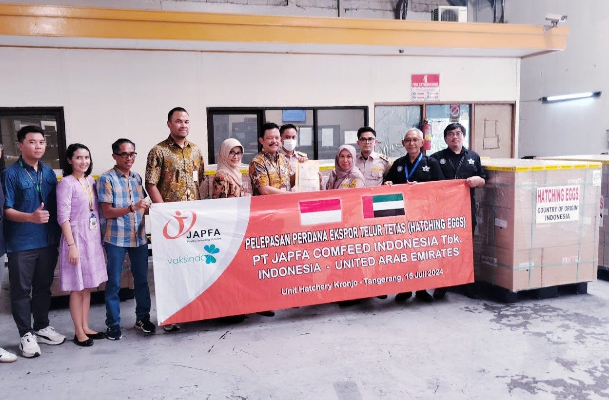 SinarHarapan.id – Direktur Corporate Affairs JAPFA, Rachmat Indrajaya (tengah) bersama manajemen JAPFA saat pelepasan ekspor telur tetas ke Dubai di Bandara Soekarna Hatta, Tangerang Banten, Senin (15/7/2024). PT Japfa Comfeed Indonesia Tbk (JAPFA) melakukan ekspor perdana produk telur tetas ke Uni Emirat Arab (United Arab Emirates).