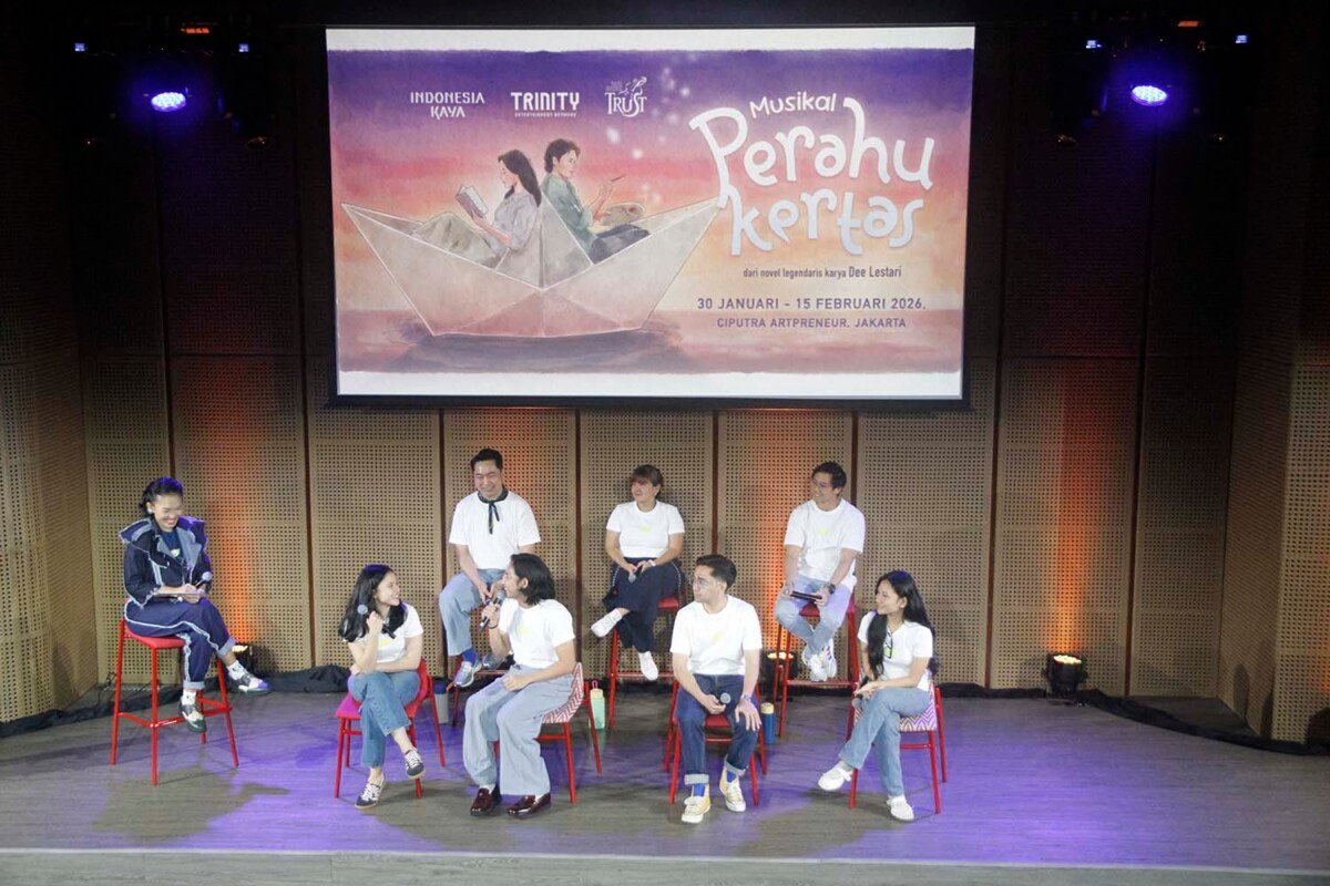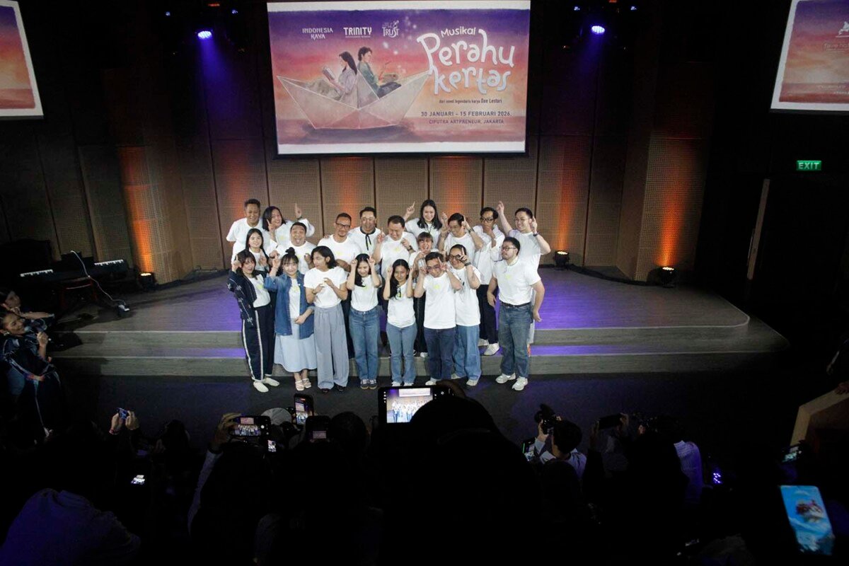 Dari sisi kreatif, Musikal Perahu Kertas melibatkan 38 pemeran dan didukung oleh 20 tim kreatif profesional. Produksi ini berada di bawah arahan Billy Gamaliel, Eunike Elisaveta, dan Chriskevin Adefrid, yang berkomitmen menghadirkan adaptasi musikal yang setia pada ruh cerita sekaligus relevan bagi penonton masa kini. Foto: Ruht Semiono