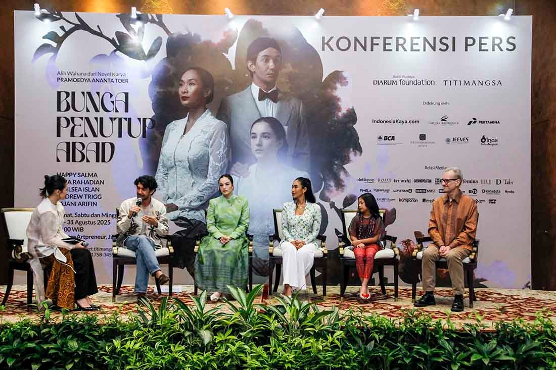 SinarHarapan.id – Dari kiri ke kanan Sutradara sekaligus Penulis Naskah Teater Wawan Sofwan, Program Director Bakti Budaya Djarum Fondation Renitasari Adrian, Produser sekaligus Pemeran Teater Happy Salma, dan Putri Pramoedya Ananta Toer, Astuti Ananta Toer, saat konpers jelang pertunjukan teater “Bunga Penutup Abad” di Jakarta, Jumat (15/8/2025).Pementasan teater “Bunga Penutup Abad” produksi Titimangsa yang dipersembahkan oleh Bakti Budaya Djarum Foundation, akan berlangsung pada 29-31 Agustus 2025 di Ciputra Artpreneur, Jakarta. Merupakan alih wahana dari dua buku pertama Tetrologi Baru karya Pramoedya Ananta Toer, yaitu “Bumi Manusia” dan “Anak Semua Bangsa”. Tahun 2025 yang juga menandai 100 tahun kelahiran Pramoedya Ananta Toer menjadi momentum refleksi dan perayaan atas kontribusi Pram bagi perkembangan sastra, sejarah, pemikiran, dan kebudayaan Indonesia. Foto: SHID/Ruht Semiono