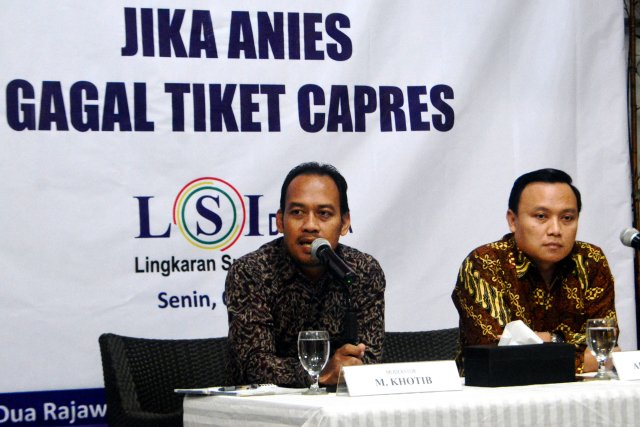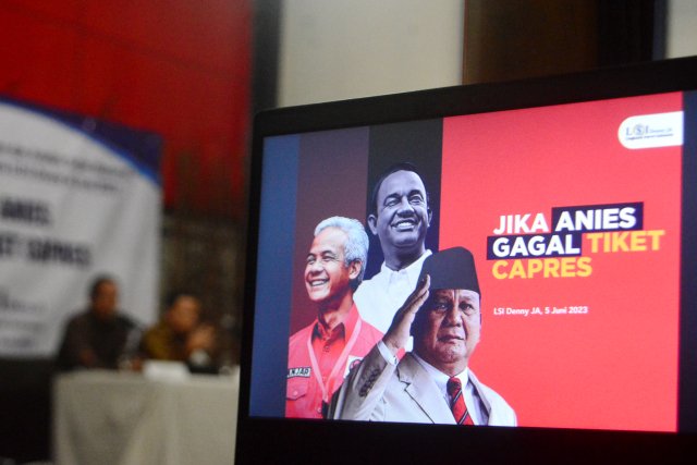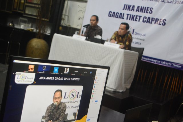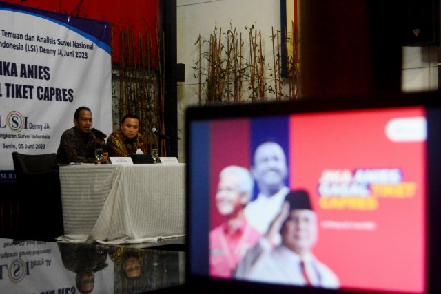 SinarHarapan.id – Peneliti LSI Denny JA, Ade Mulyana (kanan) didampingi M.Khotib (moderator) menyampaikan temuan terbaru survei nasional bertajuk “Jika Anies Gagal Tiket Capres,” saat jumpa pers di Jakarta, Senin (5/6/2023). Berdasarkan survei terbaru LSI Denny JA, elektabilitas Prabowo bahkan menyentuh angka 50,4 persen. Sementara Ganjar Pranowo 43,2 persen. Kemenangan telak bisa diraih bakal calon presiden (Bacapres) Gerindra, Prabowo Subianto jika head to head lawan bacapres PDIP, Ganjar Pranowo di 2024. Foto SHID/Elvis Sendouw