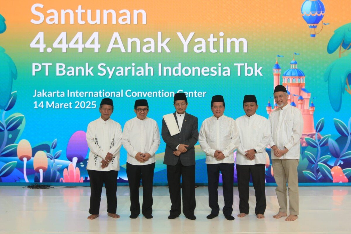 SinarHarapan.id – dari kiri ke kanan Ketua Dewan Pengawas Syariah BSI Hasanudin, Komisaris Utama BSI Muliaman D Hadad, Menteri Agama RI Nasarudin Umar, Direktur Utama BSI Hery Gunardi, Wakil Utama BSI Bob T Ananta dan Wakil Komisaris Utama BSI Adiwarman Karim (paling kanan) saat simbolis pemberian santunan kepada perwakilan anak yatim di JCC Senayan Jakarta, Jumat (14/03/2025). PT Bank Syariah Indonesia Tbk (BSI) memberikan santunan kepada 4.444 anak yatim sebagai bentuk syukur perseroan atas kinerja tahun lalu yang solid dan tumbuh di atas rerata industri. Foto: SHID/Ruht Semiono