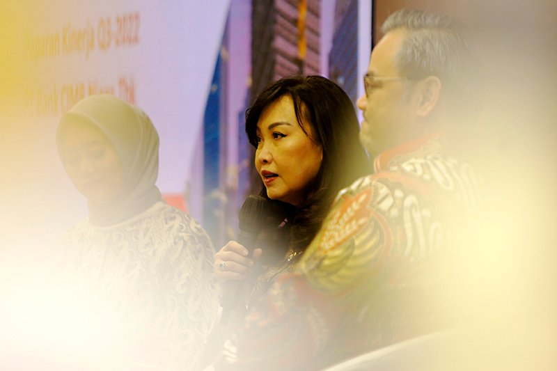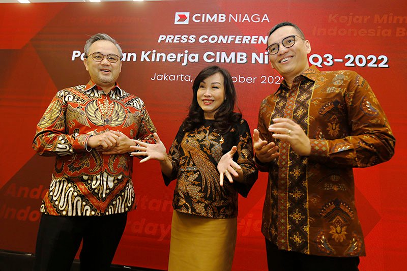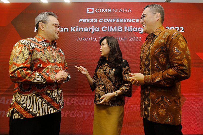 SinarHarapan.id – Presiden Direktur CIMB Niaga Lani Darmawan (tengah) berbincang bersama Direktur Strategy, Finance & SPAPM CIMB Niaga Lee Kai Kwong (kiri) dan Head of Marketing, Brand and Customer Experience CIMB Niaga Toni Darusman (kanan) sesaat sebelum Press Conference Paparan Kinerja Q3-2022 CIMB Niaga di Jakarta, Kamis (27/10/2022). CIMB Niaga melaporkan perolehan laba sebelum pajak konsolidasi (unaudited) sebesar Rp5 triliun pada sembilan bulan pertama tahun 2022 (“9M22”), naik sebesar 22,5% year-on-year (“Y-o-Y”), dan menghasilkan earnings per share Rp154,13. Hasil positif tersebut, terutama dikarenakan adanya peningkatan pendapatan seiring dengan pertumbuhan bisnis yang baik, biaya yang terkendali, dan tren kualitas underlying asset yang lebih baik. Hal ini mendorong CIMB Niaga untuk terus memberikan nilai tambah kepada para shareholders. Foto: SinarHarapan.id/Redaksi