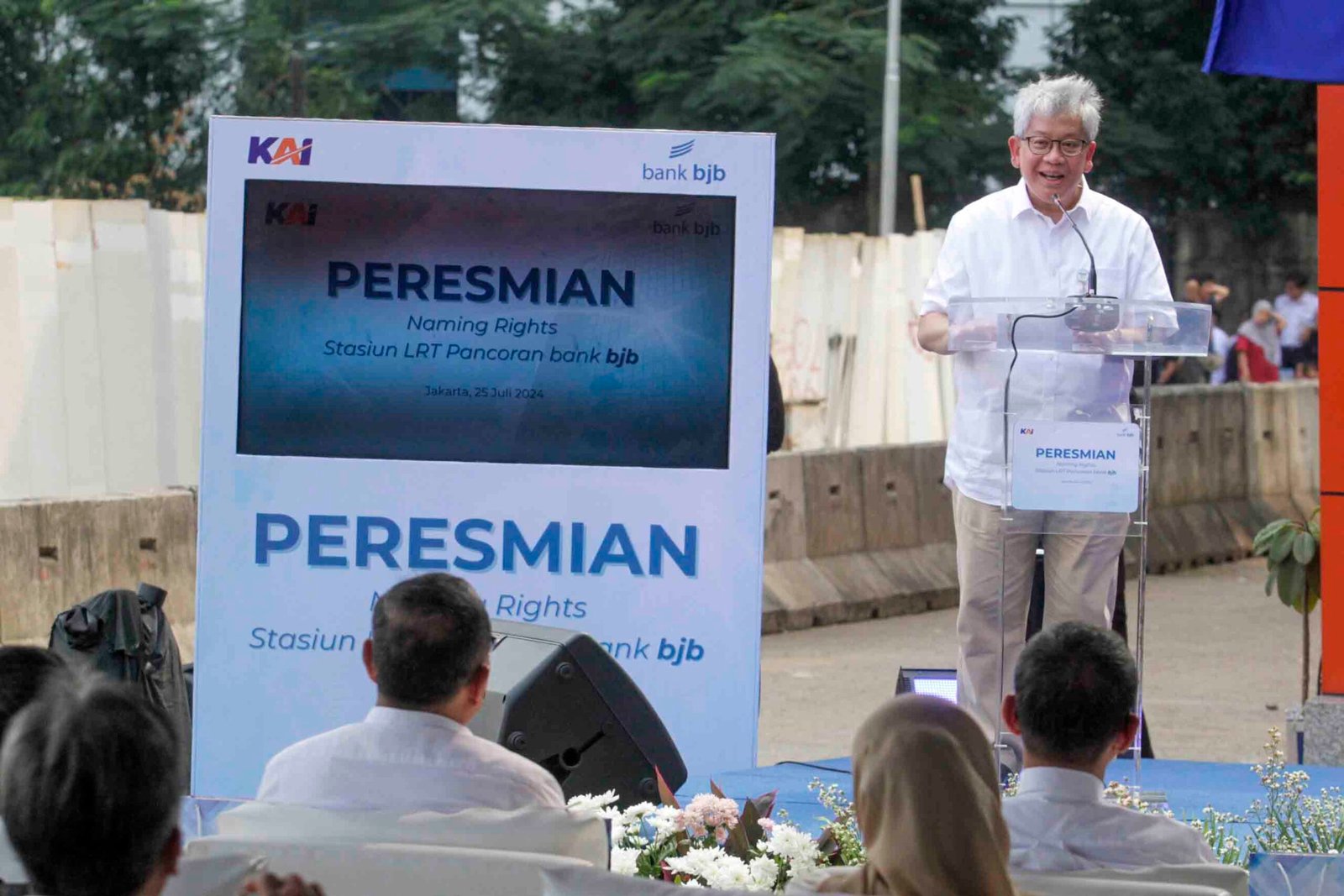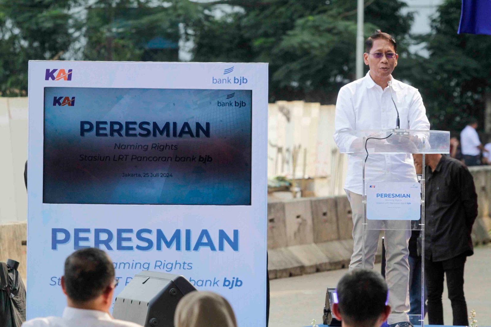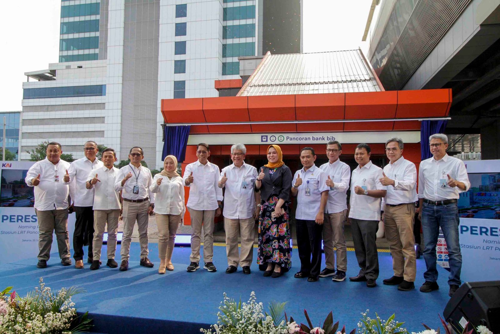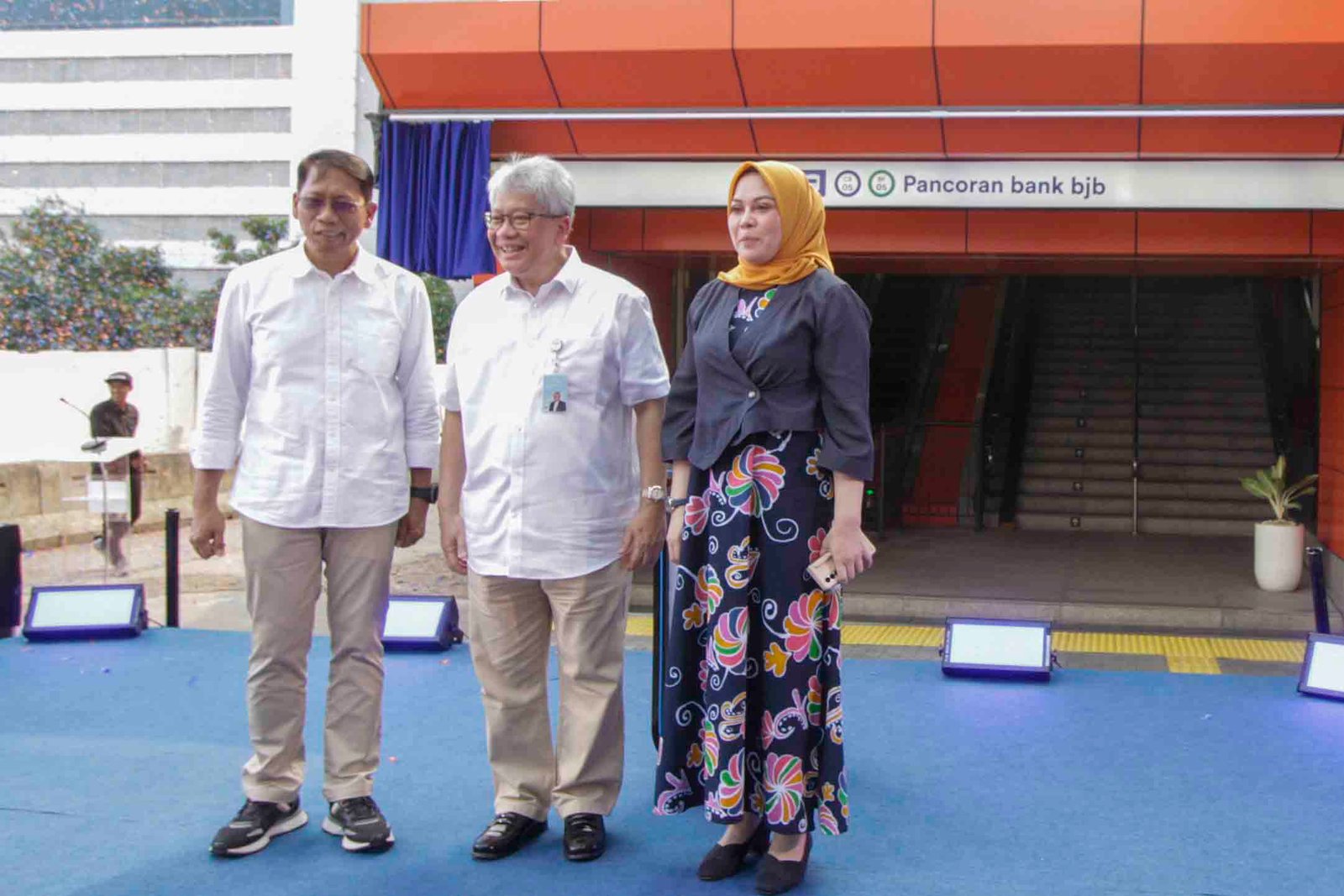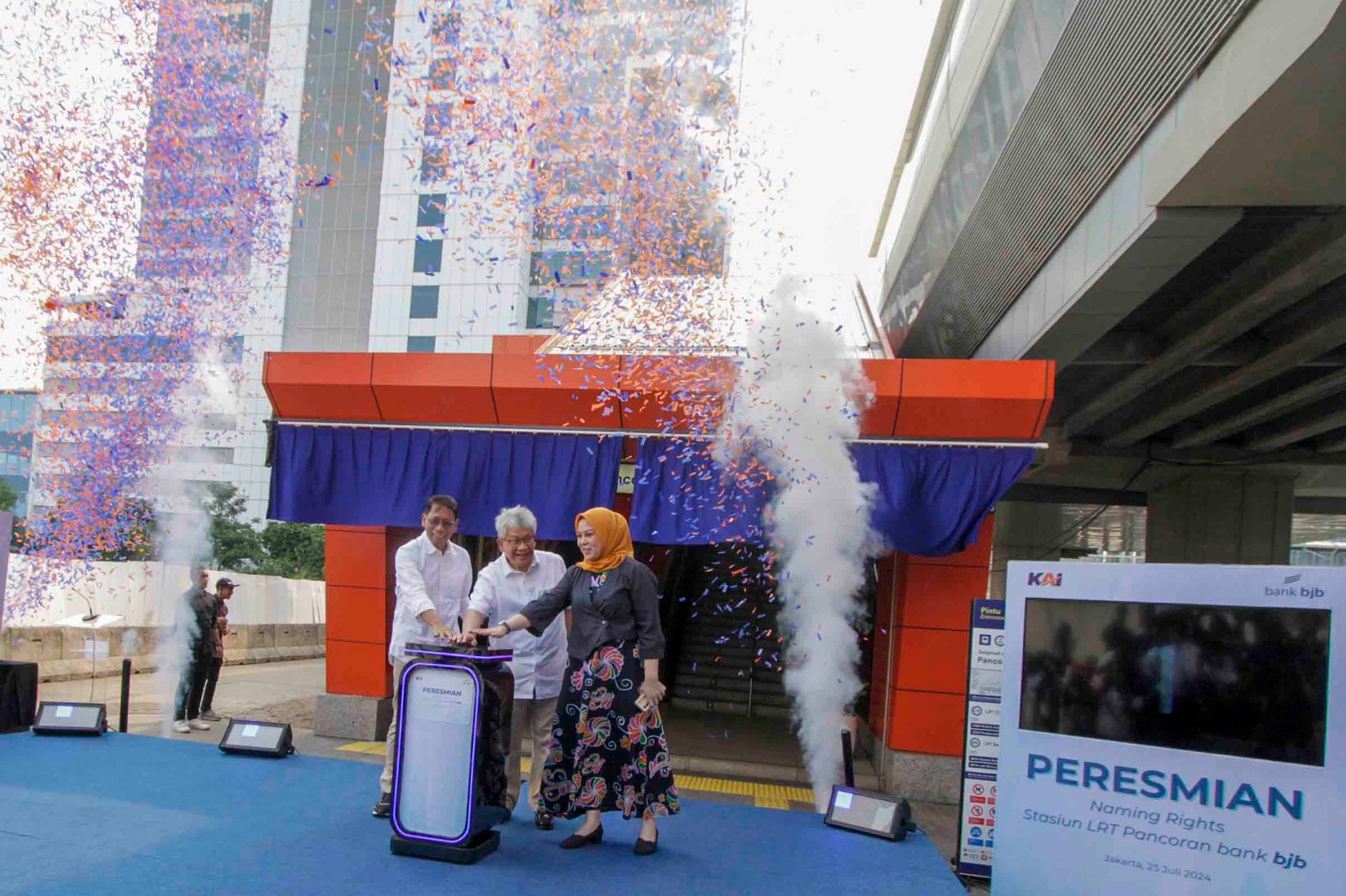 SinarHarapan.id – Direktur Utama bank bjb Yuddy Renaldi (tengah) bersama Direktur Utama PT Kereta Api Indonesia Didiek Hartantyo (kiri) dan Kepala Biro Perekonomian Sekretariat Daerah Provinsi Jawa Barat Yuke Mauliani Septina (kanan) menekan tombol saat peresmian naming rights stasiun LRT Pancoran Bank bjb di Jakarta, Kamis (25/7/2024). Bank bjb kembali meningkatkan kolaborasi dengan PT Kereta Api Indonesia yang juga merupakan BUMN, sebagai operator LRT Jabodebek melalui program penamaan stasiun atau Naming Rights, untuk stasiun di kawasan Pancoran. Stasiun LRT Jabodebek di kawasan Pancoran kini akan menggunakan nama bank bjb yaitu menjadi Stasiun LRT Jabodebek Pancoran bank bjb, sebagai bagian dari langkah strategis untuk meningkatkan visibilitas merek serta mendorong penggunaan transportasi publik di Jakarta. Foto: SHID/Ruht Semiono