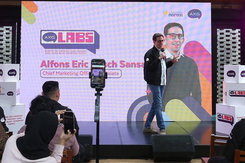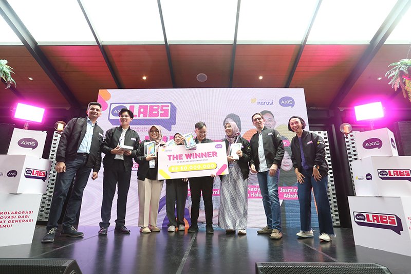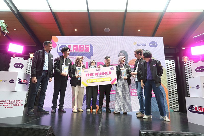 SinarHarapan.id – Group Head Youth Segment XL Axiata, Azher Javid (kiri), Chief Marketing Officer XL Axiata, Alfons Bosch Sansa (kedua kanan), dan Head Youth Marketing Communication XL Axiata, Nahdiah Estu Pawestri (kanan) bersama pemenang pertama AxisLabs 2023 di Jakarta, Kamis (16/11/2023). AXIS menghadirkan AXISLABS 2023 yang mengajak para mahasiswa untuk berkolaborasi menuangkan ide dan gagasan kreatif kemudian mengembangkannya menjadi karya inovatif. Para pemenang AXISLABS 2023 memperoleh hadiah uang tunai senilai Rp 50 juta untuk juara pertama dan Rp 15 juta untuk juara kedua. Selain itu, terdapat benefit lain yang diperoleh para peserta dalam bentuk uang saku, mentoring langsung oleh para profesional dari tim AXIS. Foto: SHID/Ruht Semiono