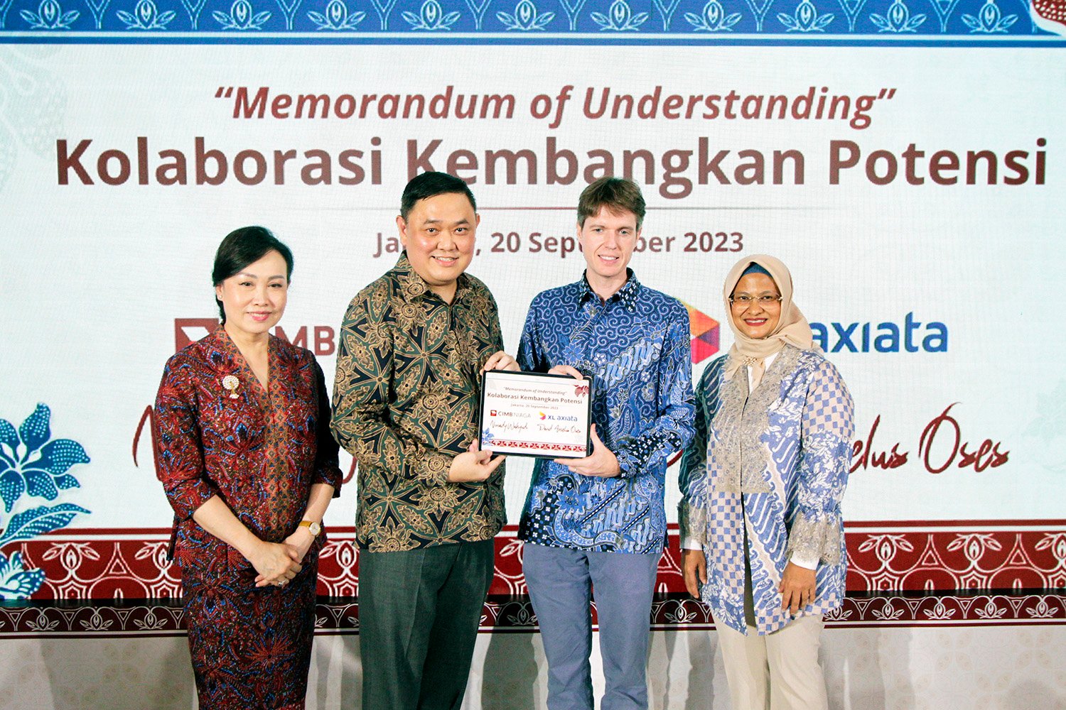 SinarHarapan. id – Presiden Direktur CIMB Niaga Lani Darmawan (kedua kiri) bersama Presiden Direktur & CEO XL Axiata Dian Siswarini (kedua kanan), Direktur Consumer Banking CIMB Niaga Noviady Wahyudi (kiri), dan Direktur & Chief Commercial Officer-Consumer XL Axiata David Arcelus Oses (kanan) pada acara “Penandatanganan MoU CIMB Niaga dan XL Axiata” di Jakarta, Rabu (20/9/2023). CIMB Niaga dan XL Axiata sepakat menjalin kerja sama strategis untuk mensinergikan layanan perbankan dan telekomunikasi guna memberikan nilai tambah bagi nasabah/konsumen dan mendukung bisnis secara berkelanjutan. Melalui kerjasama ini, pelanggan XL Axiata dapat mengakses layanan perbankan seperti pembukaan tabungan, layanan pembayaran, e-wallet, pengajuan pinjaman, hingga diskon langganan melalui aplikasi myXL begitu pula sebaliknya nasabah CIMB Niaga akan bisa mendapatkan layanan XL Axiata melalui aplikasi digital milik CIMB Niaga. Kolaborasi sesama pemain utama di industri perbankan dan telekomunikasi ini diharapkan dapat meningkatkan inklusi keuangan dan memperluas akses digital bagi masyarakat Indonesia. Foto: SHID/Ruht Semiono