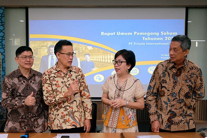 SinarHarapan.id – Direktur PT Trisula International Tbk (TRIS) Kartono Budiman bersama Direktur Utama TRIS Widjaya Djohan,Komisaris Utama TRIS Tjhoi Lisa Tjahjadi dan Komisaris Independen TRIS Fendy Sutanto berbincang seusai Rapat Umum Pemegang Saham Tahunan, Senin (10/4/2023). PT Trisula International Tbk (TRIS), emiten integrated apparel provider di bidang tekstil dan garmen memutuskan membagikan deviden sebesar Rp 20,23 miliar, atau 31% dari laba bersih tahun 2022 Jumlah dividen yang dibagikan tahun ini naik 268% dibandingkan dividen yang dibagikan Perseroan tahun 2021 yang sebesar Rp 5,5 miliar. Foto: SRID/Ruht Semiono