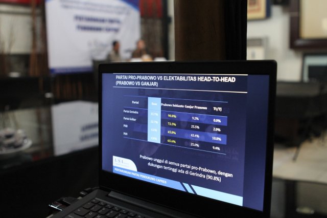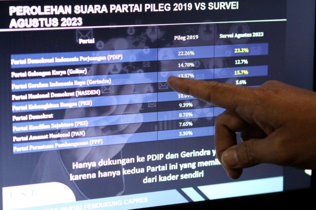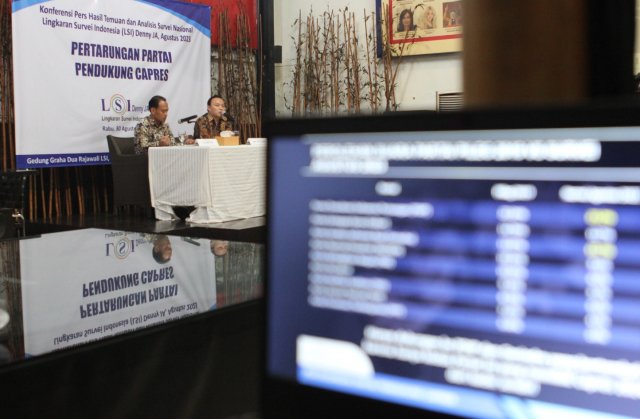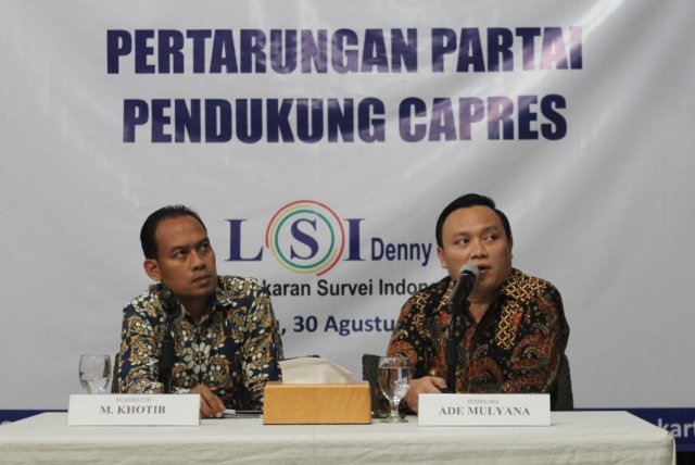 SinarHarapan.id – Peneliti senior LSI Denny JA, Ade Mulyana (kanan) didampingi moderator M.Khotib saat merilis hasil temuan dan analisis Survei Nasional bertajuk “Pertarungan Partai Pendukung Capres” di Jakarta, Rabu (30/8/2023). Survei LSI menyatakan meskipun elektabilitas Ganjar Pranowo mengalami kenaikan diangka 35,8%, namun masih kalah tipis dari Prabowo Subianto sebesar 36,2%, sedangkan Anies Baswedan masih dibawah sebesar 19,7%. SHID/Elvis Sendouw