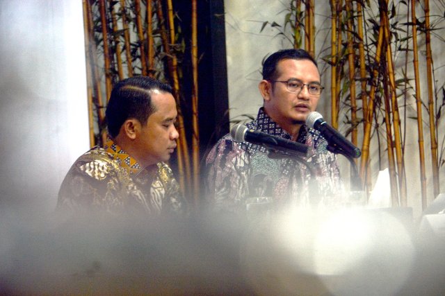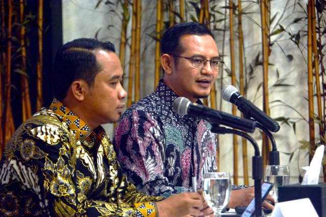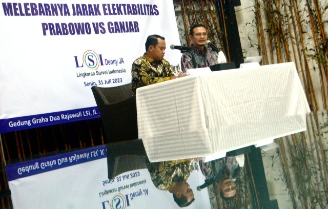 SinarHarapan.id – Peneliti senior LSI Denny JA, Hanggoro Doso Pamungkas (kanan) didampingi moderator Lana Maulana menyampaikan temuan dan analisis Survei Nasional bertajuk “Melebarnya Jarak Elektabilitas Prabowo Vs Ganjar” di Jakarta, Senin (31/7/2023). Hasil survei LSI menyatakan Prabowo Subianto unggul di pemilih partai yaitu, Gerindra, Golkar, PKB, Nasdem, PKS, Demokrat, PAN, PPP dan partai lainnya. Dukungan terhadap Prabowo di pemilih partai Gerindra merupakan yang tertinggi sebesar 93.3%. Sedangkan Ganjar Pranowo unggul di pemilih PDIP sebesar 81%. Foto SHID/Elvis Sendouw