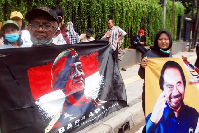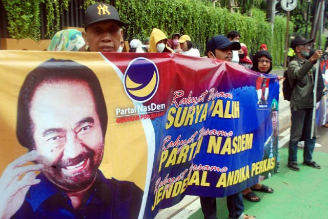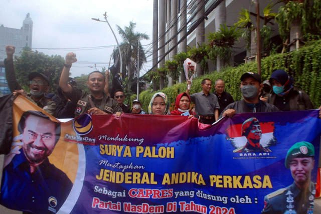 SinarHarapan.id – Puluhan massa yang tergabung dalam Barisan Relawan Andika Presiden Indonesia (Bara Api) menggelar aksi damai didepan kantor DPP NasDem, Jakarta, Kamis (29/9/2022). Dalam aksinya, massa mendukung Ketum Nasdem Surya Paloh untuk menetapkan Jenderal Andika Perkasa sebagai Capres 2024 yang diusung partai NasDem. Foto SH/Din