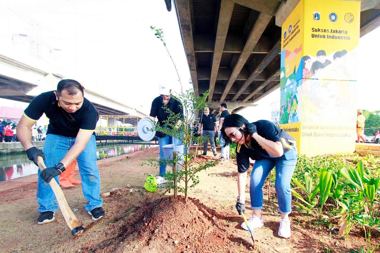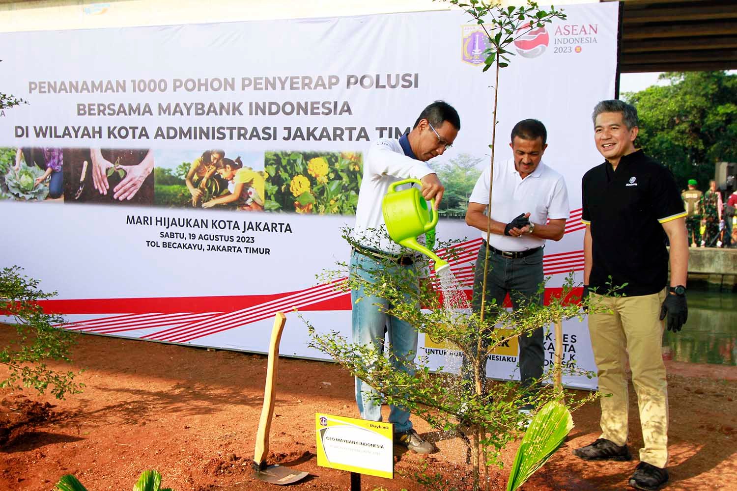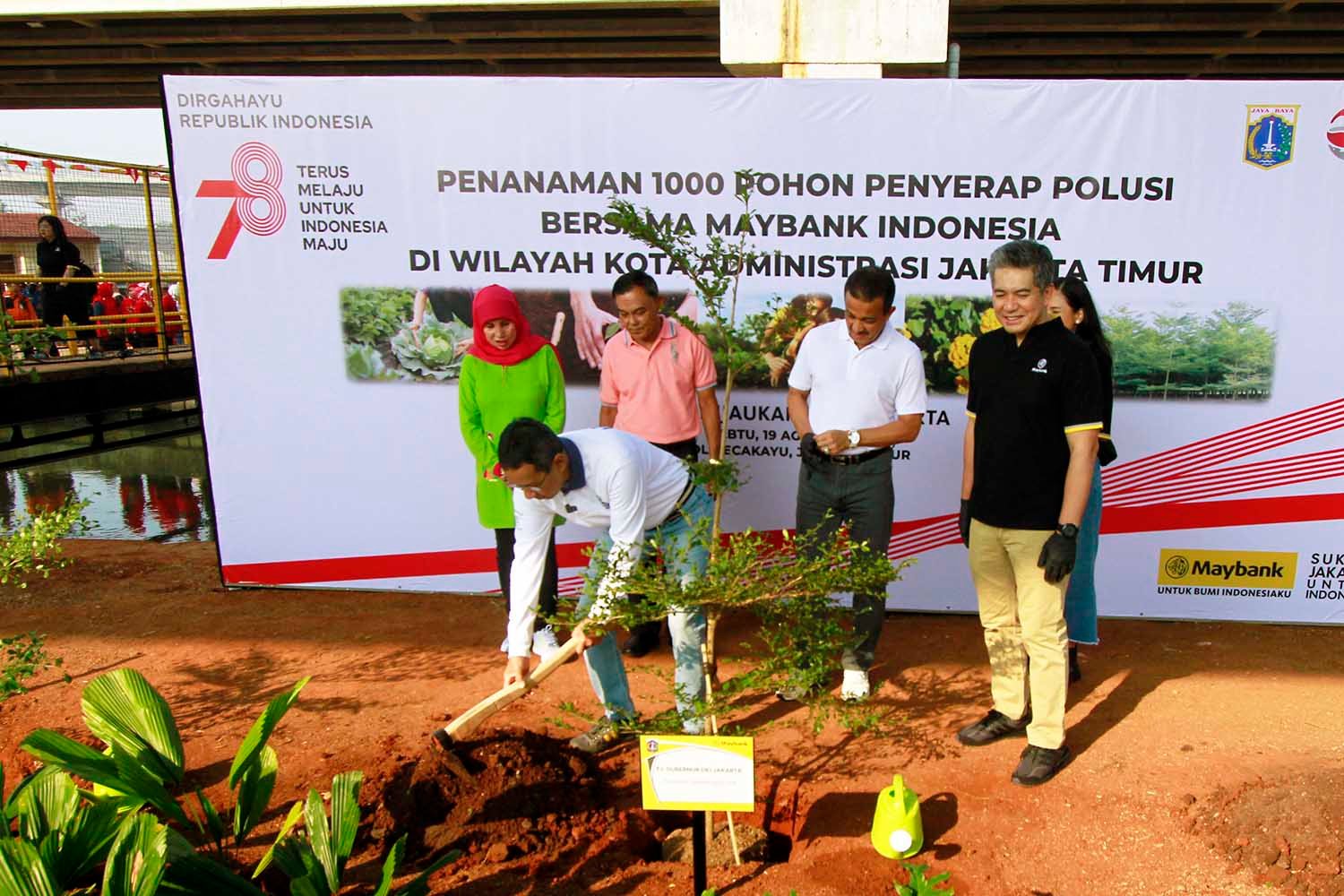 SinarHarapan.id – Pj. Gubernur DKI Jakarta Heru Budi Hartono (kiri) didampingi Presiden Direktur Maybank Indonesia Taswin Zakaria (kanan) mengadakan kegiatan penanaman pohon di bawah tol Becakayu (Bekasi – Cawang – Kampung Melayu) untuk mendukung perbaikan kualitas udara Jakarta. Jenis pohon dan tanaman yang ditanam sebanyak 1.500 pohon, terdiri dari 1.000 pohon ketapang kencana (tanaman penyerap polusi) dan 500 tanaman alpukat cipedak dan tanaman refugia bunga kuning (tanaman anti hama)di Jakarta, Sabtu (19/8/2023). Dalam suasana perayaan Kemerdekaan Indonesia, PT Bank Maybank Indonesia, Tbk. (“Maybank Indonesia”) menggelar acara penanaman pohon dan pemilahan sampah untuk menerapkan Tujuan Pembangunan Berkelanjutan (Sustainability Development Goals/SDGs) melalui penyelenggaraan Global Corporate Responsibility Day (Global CR Day) 2023 yang bertajuk “Untuk Bumi Indonesiaku”, di Jakarta, Sabtu, 19 Agustus 2023.