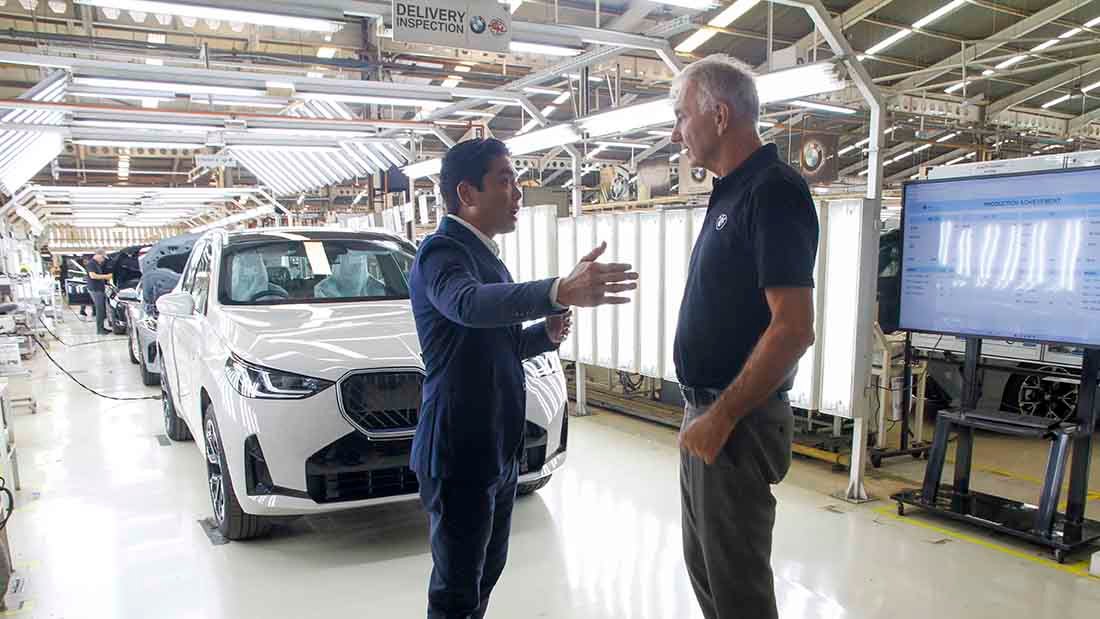 SinarHarapan.id – President Director BMW Group Indonesia Peter Medalla (kedua kiri) berbincang dengan President Director PT Gaya Motor Triani Handoyo (kanan), Director of Communication BMW Group Indonesia Jodie O`tania (kiri) dan Management Production Partner Indonesia of BMW Group Production Network 2 Matthias Ostermeier (kedua kanan) berbincang saat mengunjungi BMW Production Network 2, Gaya Motor, Sunter, Jakarta, Jumat (11/7/2025). Pabrik tersebut merakit kendaraan model terbaru dari BMW All-New BMW X3 dan New BMW 2 Series Gran Coupe secara lokal dengan komponen yang didatangkan dari luar negeri seperti Jerman dan Amerika serta dipantau oleh tim ahli agar memenuhi standra global. Foto: SHID/Ruht Semiono