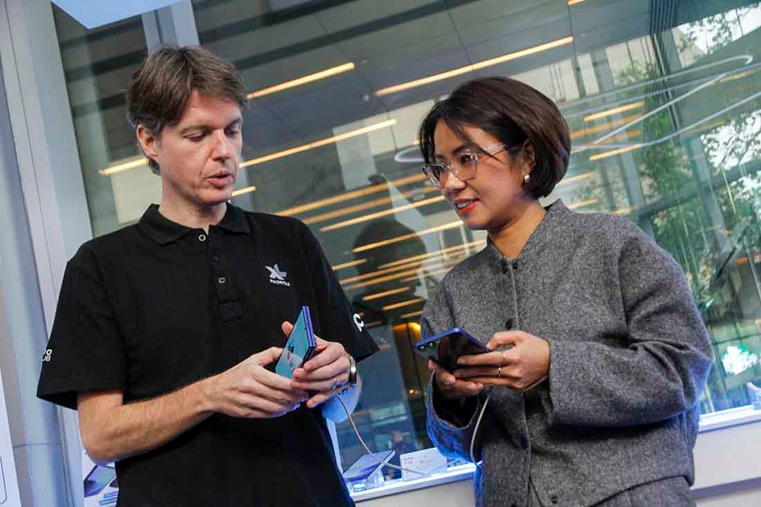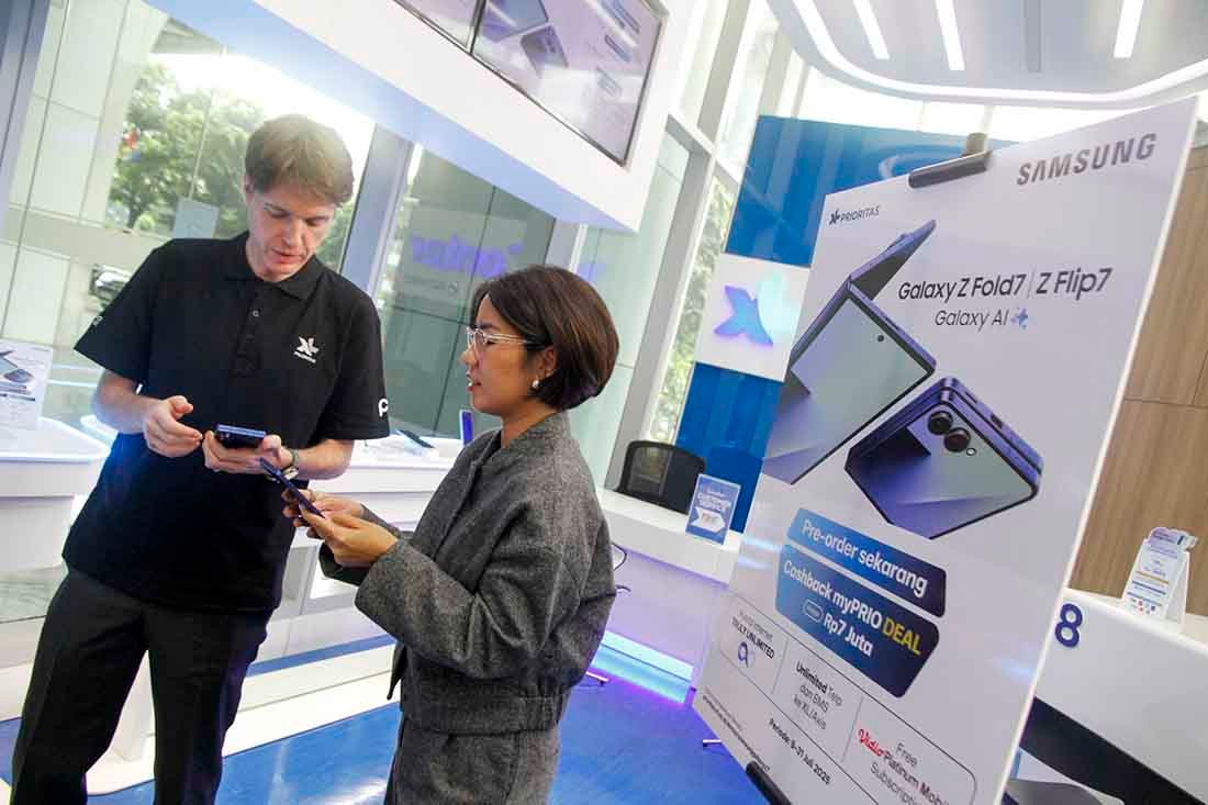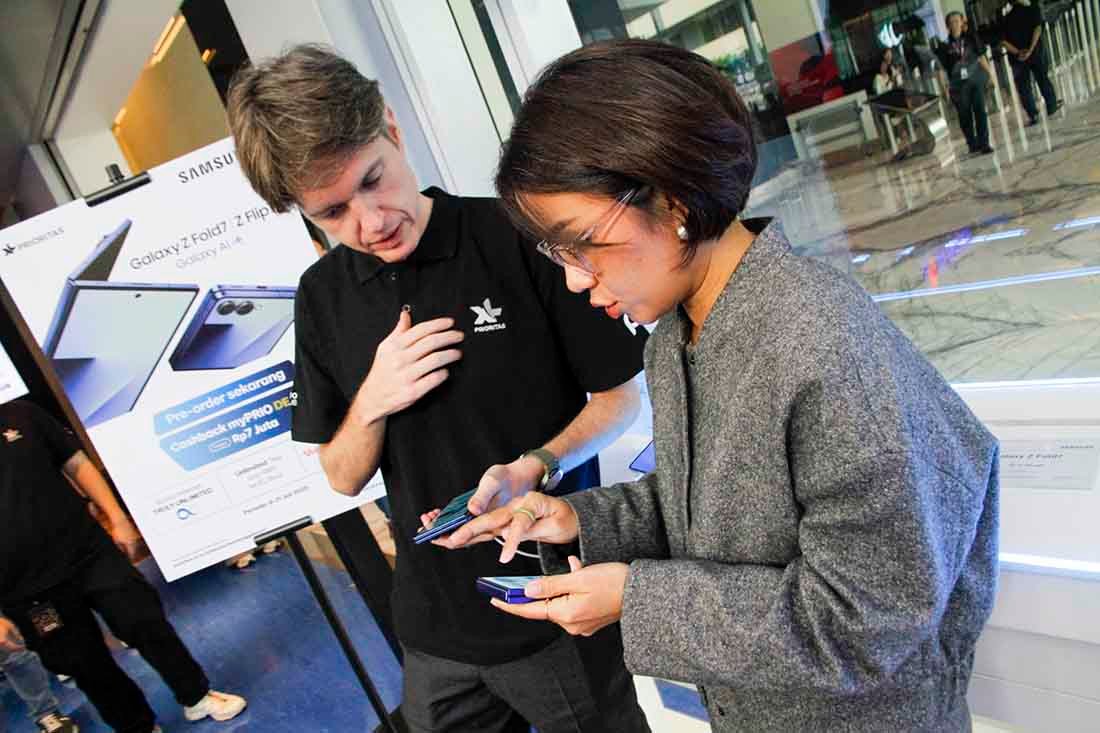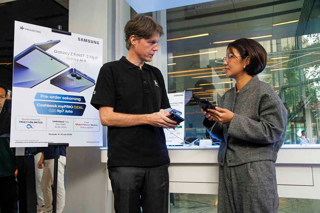 SunarHarapan.id – Direktur & Chief Commercial Officer XLSMART David Arcelus Oses (kiri) berbincang dengan MX (Mobile Experience) Category Management Director Samsung Electronics Indonesia, Selvia Gofar (kanan) di sela-sela Launching Bersama Exclusive Bundling Samsung Galaxy Z Series dan myPRIO DEAL XL PRIORITAS di XL Center, XLSMART Tower, Jakarta, Jumat (11/7/2025). PT XLSMART Telecom Sejahtera Tbk (XLSMART) berkolaborasi dengan Samsung Electronics Indonesia, kembali menghadirkan bundling eksklusif untuk produk flagship terbaru, Samsung Galaxy Z Fold7 dan Z Flip7. Bertepatan dengan pre-order resmi yang dimulai pada 9 Juli 2025 kemarin, XL PRIORITAS meluncurkan produk bundling baru yaitu myPRIO Deal Unlimited, dimana pelanggan dapat menikmati cashback hingga Rp 7 juta dan kuota data unlimited selama 2 tahun. Foto: SHID/Ruht Semiono