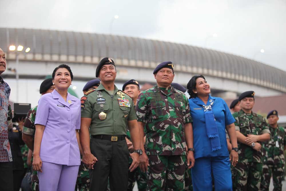 Panglima TNI Jenderal Andika Perkasa (kiri) beserta istri Diah Erwiany Trisnamurti Hendrati (kanan) berbincang dengan KASAL Laksamana TNI Yugo Margono (kedua kiri) dan istri Veronica Yulis (ketiga kiri) usai upacara pelepasan prajurit Satgas Maritim Task Force (MTF) TNI Kontingen Garuda XXVIII-N/UNIFIL Tahun 2022 di Kolinlamil Tanjung Priok, Jakarta, Kamis (1/12/2022). Dalam misi perdamaian dunia yang dipimpin Letkol Laut (P) John David Nalasakti Sondakh tersebut membawa 119 personel menggunakan kapal perang KRI Frans Kaisiepo-368 menuju Lebanon dalam rangka misi perdamaian PBB untuk mencegah timbulnya konflik bersenjata Lebanon-Israel. SH/Andrey.