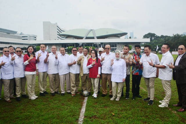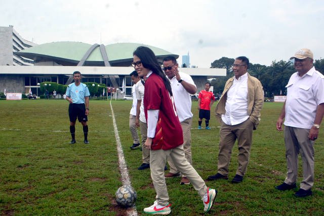 SinarHarapan.id – Partai Gerindra merayakan hari ulang tahun (HUT) Ke-15 dengan menyelenggarakan pertandingan sepak bola Fraksi Gerindra Cup di Lapangan sepak bola DPR, Kompleks Parlemen, Senayan, Jakarta, Selasa (31 Januari 2023). Siti Nurizka Puteri Selaku Ketua Pelaksana HUT Gerindra Ke-15 dan Anggota Komisi III DPR membuka pertandingan Sepak Bola Fraksi Gerindra CUP dengan pelepasan balon dan kick off menendang bola dilapangan. Tampak hadir sejumlah Anggota DPR Fraksi Gerindra dalam HUT Ke-15. Dalam pertandingan pembuka tersebut Tim Gedung Taman DPR melawan Tim DPP Gerindra. Foto SH/Elvis Sendouw