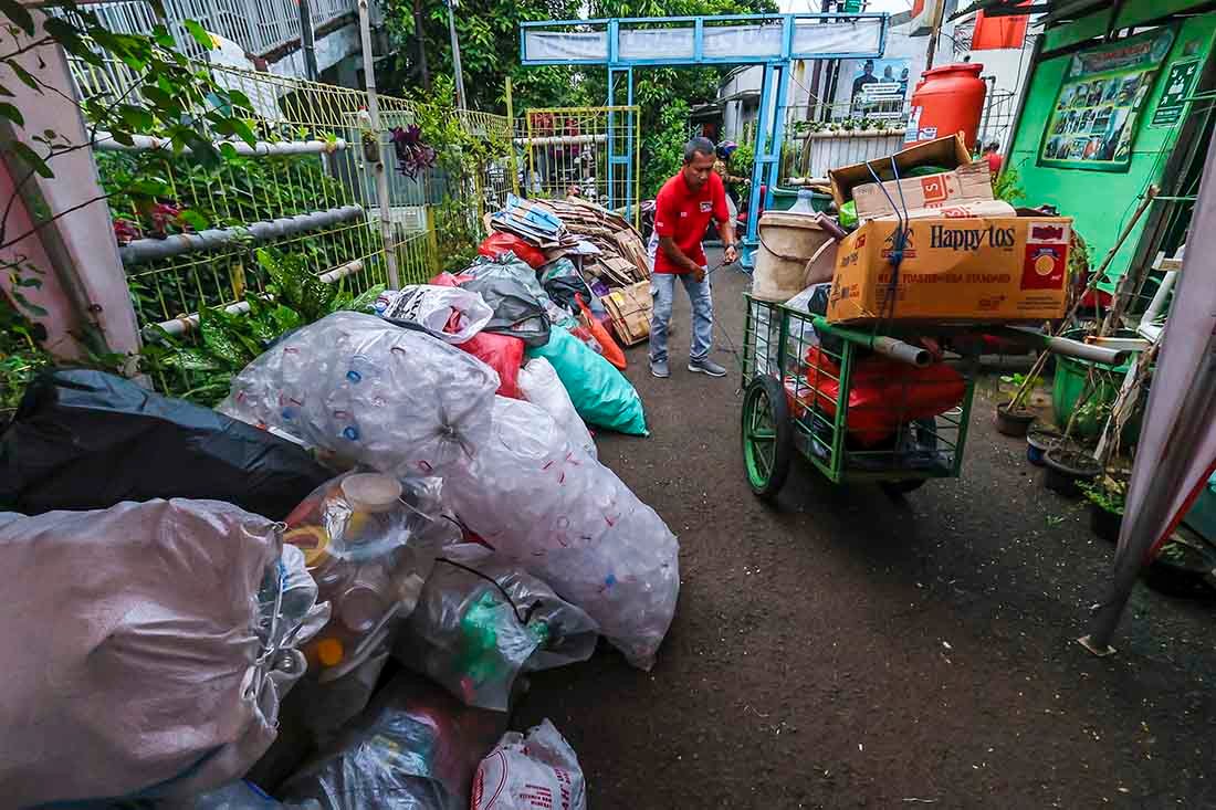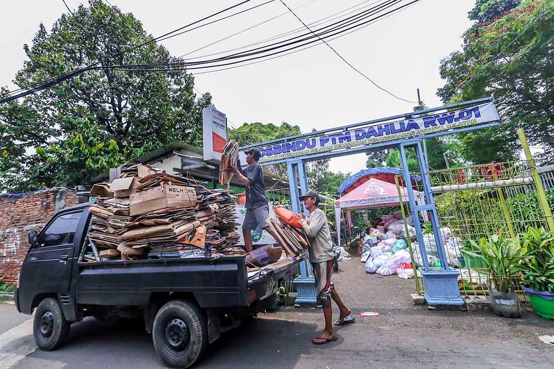 Warga membawa sampah untk ditimbang di Bank Sampah Dahlia Indah. Bank Sampah merupakan fasilitas yang mengusung prinsip 3R (Reduce, Reuse, Recycle) untuk mengedukasi masyarakat soal pentingnya memilah sampah.