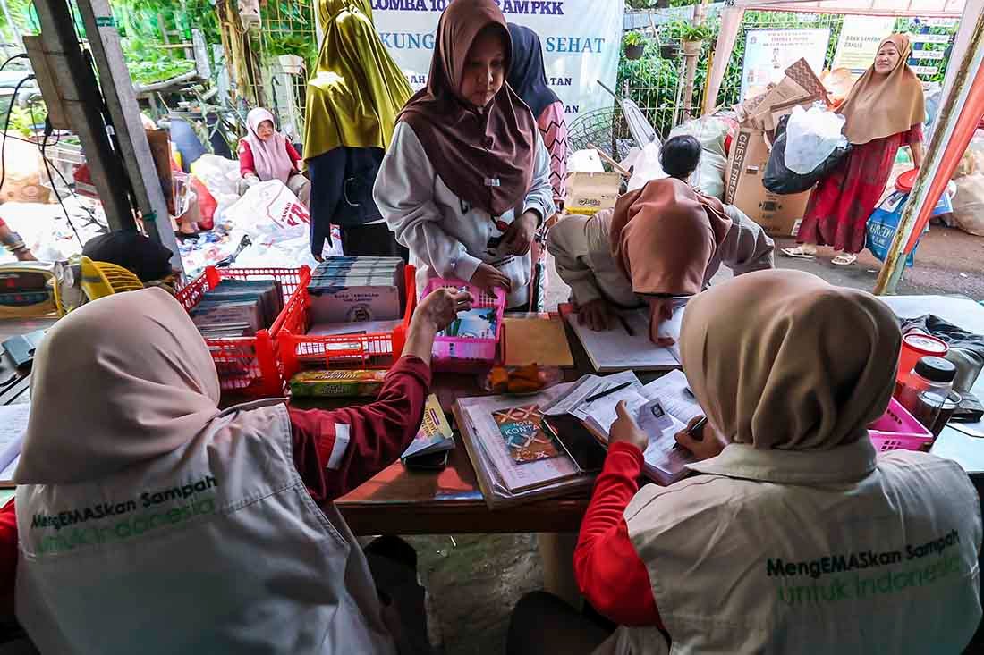 Suasana penimbangan sampah di Bank Sampah Dahlia Indah yang merupakan Mitra Pegadaian di Petukangan Selatan, Pesangrahan, Jakarta, Senin (22/9/2025). PT Pegadaian berkomitmen membangun ekosistem bisnis berbasis emas, dengan menciptakan ekonomi hijau yang mendongkrak kesejahteraan masyarakat melalui program Memilah Sampah Menjadi Emas berkolaborasi dengan bank sampah. Foto: SHID/Ruht Semiono