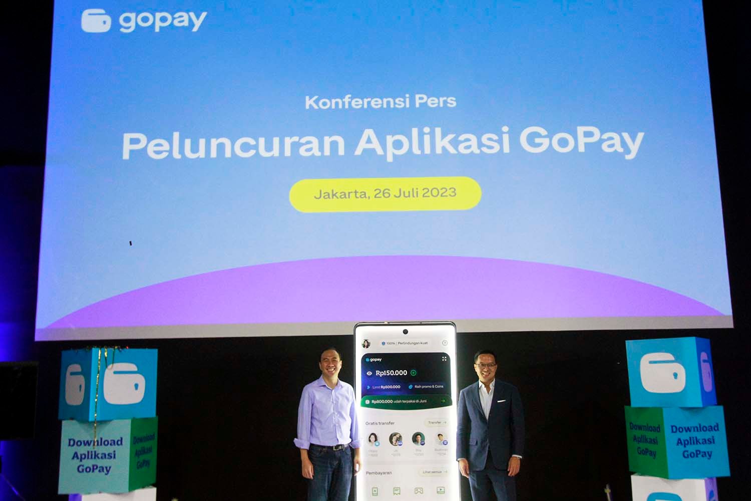SinarHarapan.id – Presiden Unit Bisnis Financial Technology GoTo Hans Patuwo (kiri) dan CEO Grup GoTo Patrick Walujo (kanan) secara resmi melakukan peluncuran Aplikasi GoPay saat Jumpa Pers di Jakarta, Rabu (26/7/2023). Aplikasi GoPay disiapkan untuk menjangkau semua lapisan masyarakat ini hadir dengan ukuran ringan sehingga dapat diunduh di berbagai jenis smartphone. Selain itu, aplikasi GoPay memiliki tampilan yang jelas dan ringkas sehingga mudah digunakan dan dipahami siapapun. Meskipun GoPay memiliki aplikasi yang berdiri sendiri, layanan GoPay tetap dapat digunakan dan terus dikembangkan di aplikasi Gojek dan Tokopedia. Foto: SHID/Ruht Semono