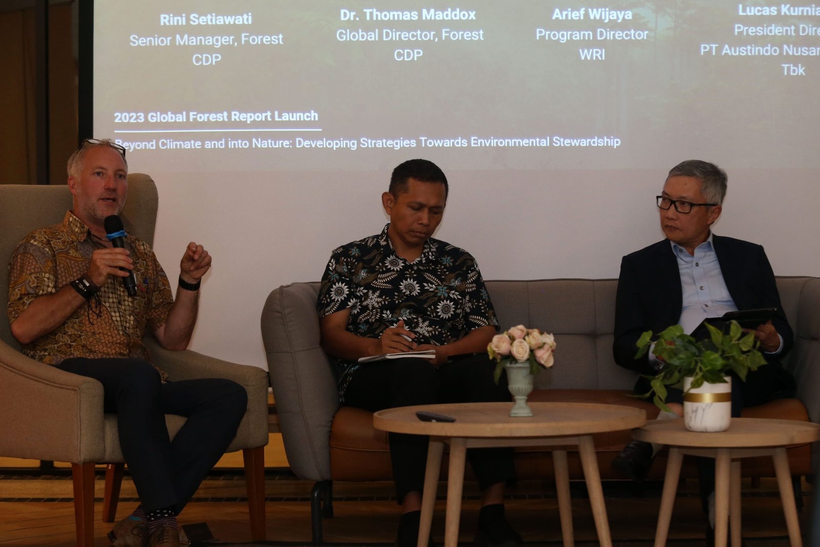 SinarHarapan.id – Sejumlah narasumber (dari kiri ke kanan) Global Director of Forest and Land, CDP Tom Maddox, Direktur Program WRI Arief Wijaya danPresident Director PT. Austindo Nusantara Jaya Tbk Lucas Kurniawan saat berdiskusi tentang cara mengatasi masalah lingkungan secara holistik, termasuk perkembangan regulasi dan standar terkini, dalam acara “Beyond Climate and Into Nature” di Jakarta 2 Agustus 2023. Temuan dari Laporan Hutan Global CDP 2023 menunjukkan bahwa sebanyak 1.043 perusahaan telah melakukan pengungkapan melalui kuesioner hutan CDP di tahun 2022, meningkat 300% dalam lima tahun terakhir, termasuk 35 perusahaan di Asia Tenggara. Hal ini menjadi pertanda positif bahwa banyak perusahaan yang mulai menyadari pentingnya hutan dan mulai terbuka untuk mengungkapkan dampak operasional bisnisnya terhadap hutan. Foto: SHID: Istimewa