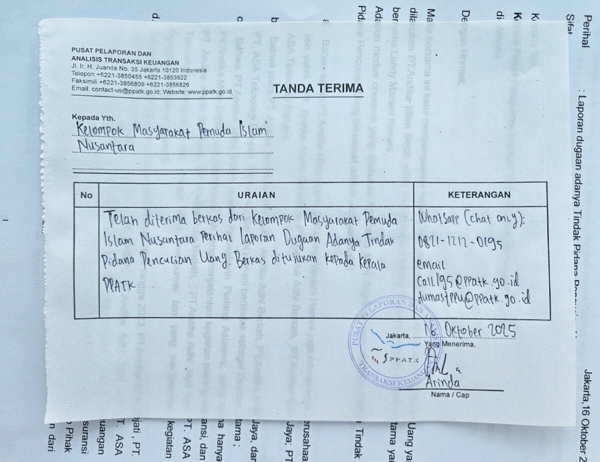 SinarHarapan.id – Organisasi Pemuda Islam Nusantara (PIN) melalui Koordinator Nasionalnya, Richard, resmi melayangkan laporan dugaan tindak pidana pencucian uang dan penggelapan pajak terhadap PT AMS sebuah perusahaan pialang asuransi yang beroperasi di Indonesia. Laporan tersebut disampaikan kepada Pusat Pelaporan dan Analisis Transaksi Keuangan (PPATK) Republik Indonesia di Jakarta.