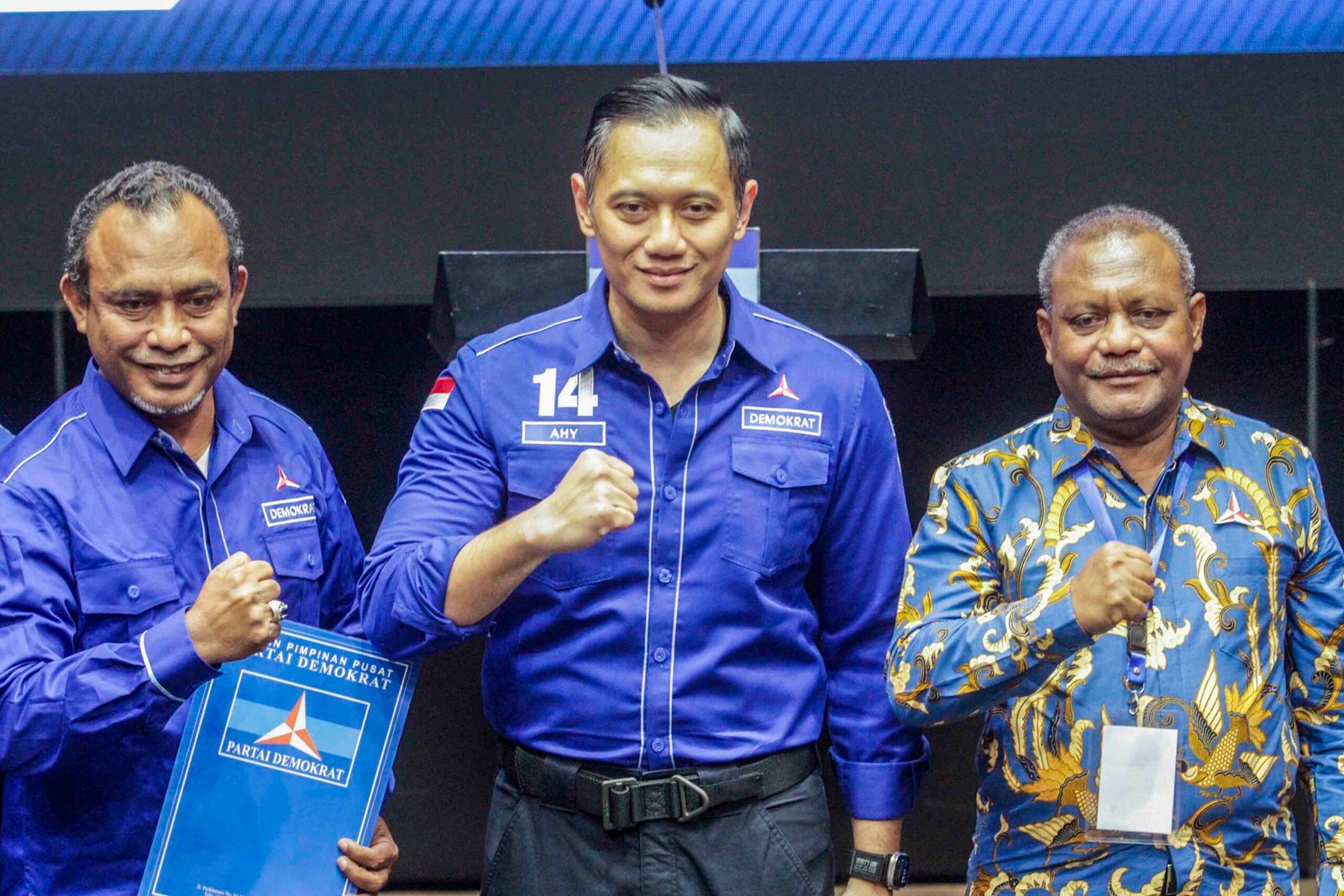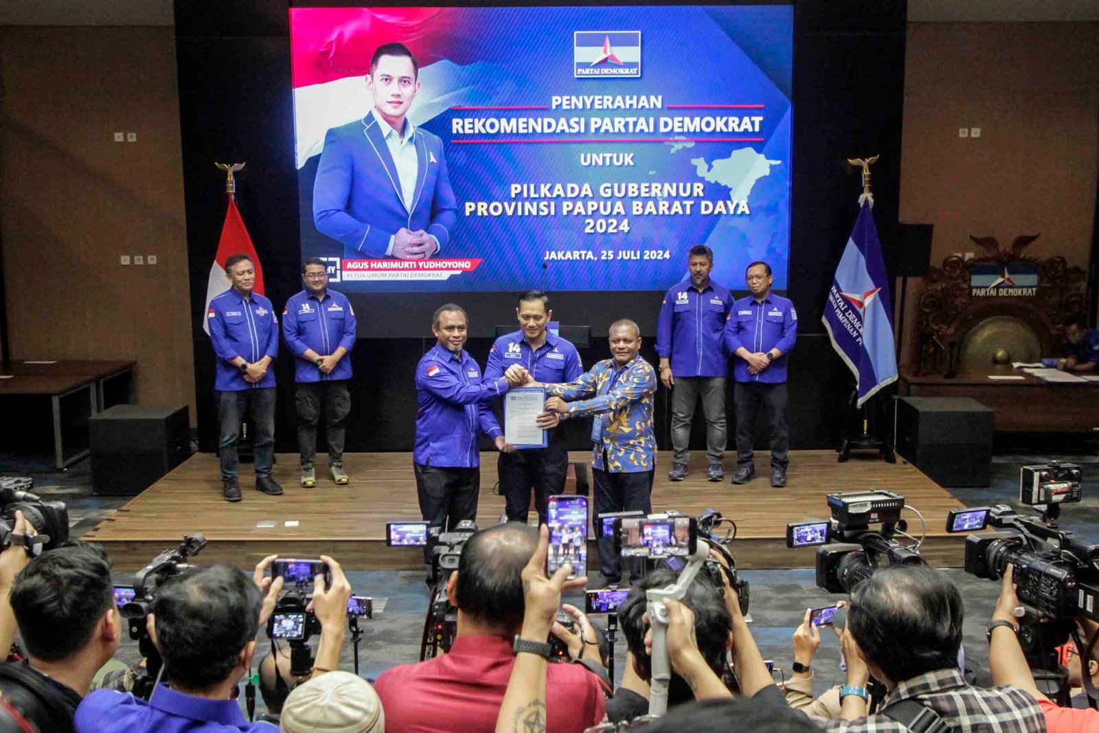 SinarHarapan.id – Ketua Umum Partai Demokrat Agus Harimurti Yudhoyono (tengah) menyerahkan surat rekomendasi kepada bakal calon Gubernur Papua Barat Daya Abdul Faris Umlati dan bakal calon Wakil Gubernur Papua Barat Daya Petrus Kasihiw di DPP Partai Demokrat, Jakarta, Kamis (25/7/2024). Agus Harimurti Yudhoyono menyerahkan 55 surat rekomendasi kepada pasangan kader Partai Demokrat untuk maju dalam Pilkada 2024. Foto: SHID/Ruht Semiono