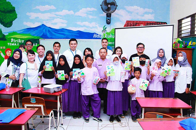 Direktur Human Resources PermataBank Dayan Sadikin bersama karyawan PermataBank sebagai Employee Volunteers berfoto bersama dengan siswa seusai saat kegiatan bersama siswa dalam kelas literasi keuangan pada acara PermataBank CERITA di SDN Pondok Kacang Timur 04, Pd. Aren, Tangerang Selatan.