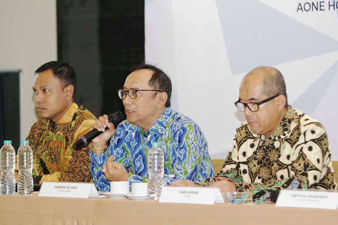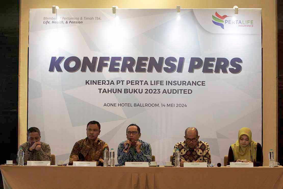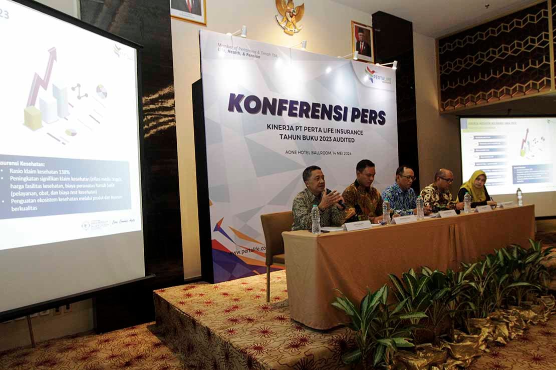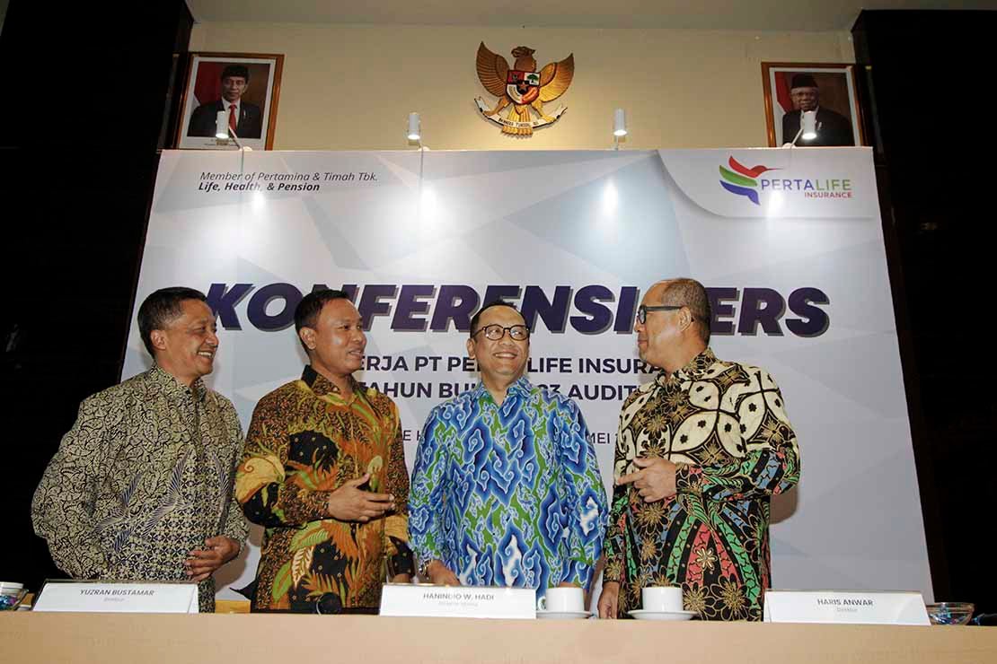 SinarHarapan.id – Jajaran Manajemen PT Perta Life Insurance (PertaLife Insurance) dari kiri ke kanan: Appointed Actuary (Joko Suwaryo), Direktur Keuangan & Investasi (Yuzran Bustamar), Direktur Utama (Hanindio W. Hadi), dan Direktur Pemasaran (Haris Anwar), foto bersama saat Pemaparan Perta Life Insurance Tahun Buku 2023 yang berlangsung di AONE Hotel Ballroom, Jakarta (14/5/2024). PertaLife Insurance kembali menorehkan kinerja gemilang sepanjang 2023 dengan meraih laba bersih sebesar Rp96,14 Miliar atau meningkat sebesar 32,61% dibandingkan tahun sebelumnya sebesar Rp72,49. Laba tersebut ditopang oleh kenaikan pendapatan premi, pendapatan investasi, dan imbal jasa DPLK. Foto: SHID/Ruht Semiono