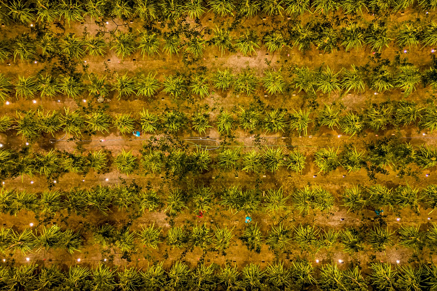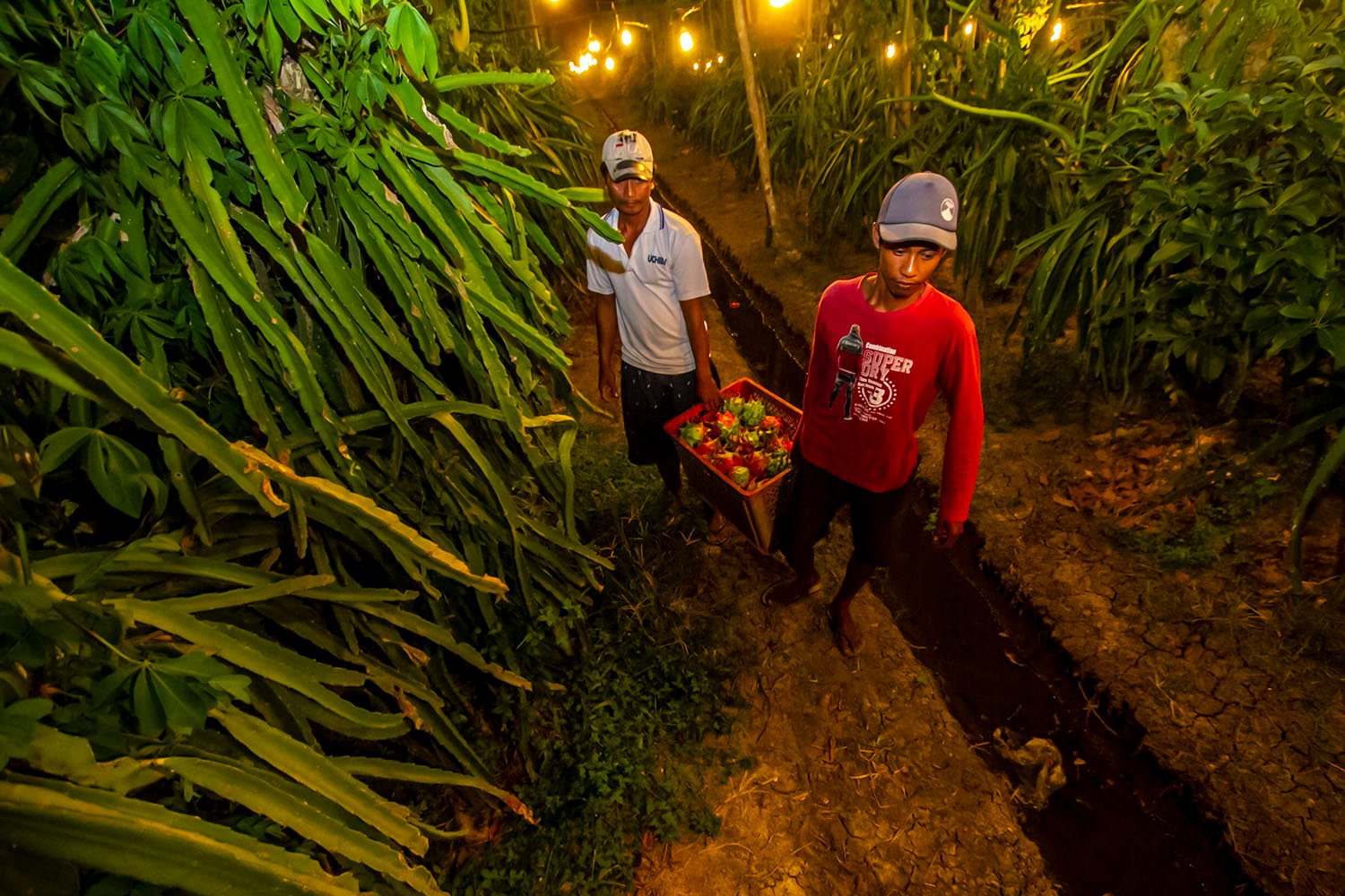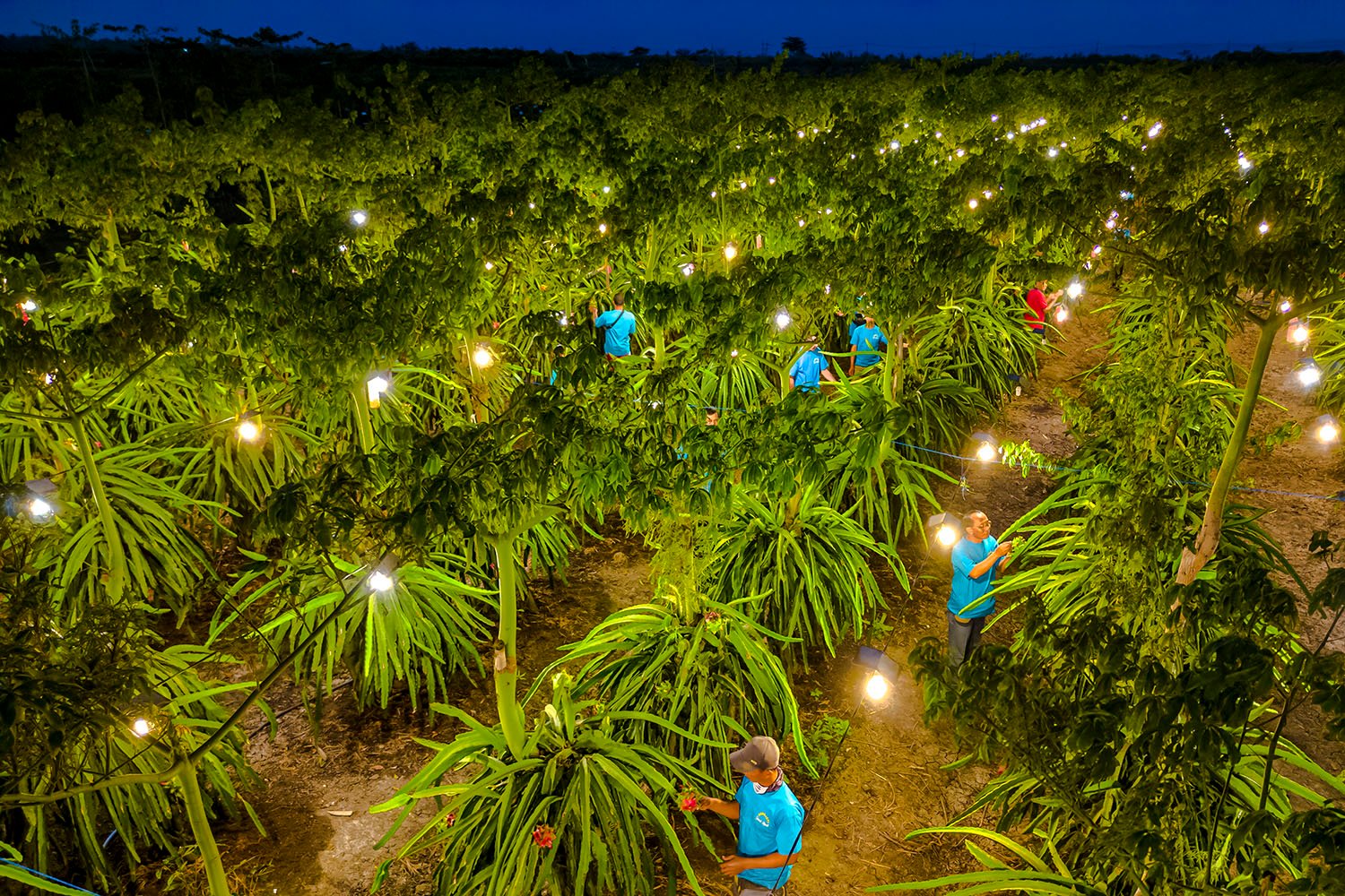Kerlip lampu cahaya menerangi kebun buah naga. Cahaya itu berasal dari lampu-lampu Light Emitting Diode (LED) yang dipasang di atas pohon buah naga. untuk membantu buah naga berbunga dan berbuah di luar musimnya.