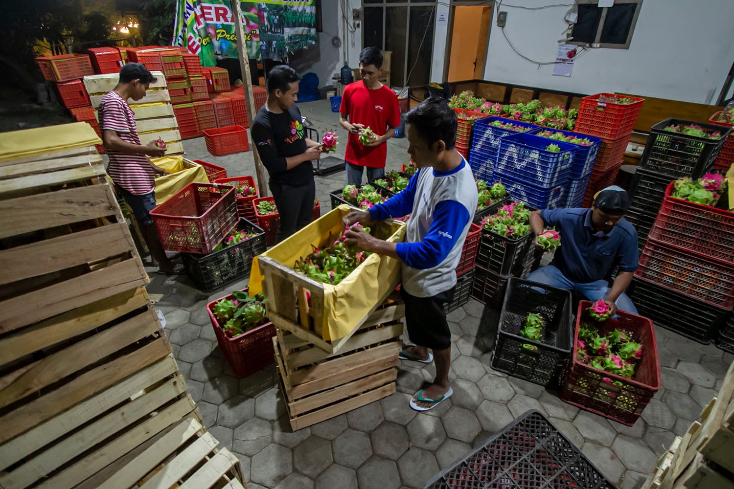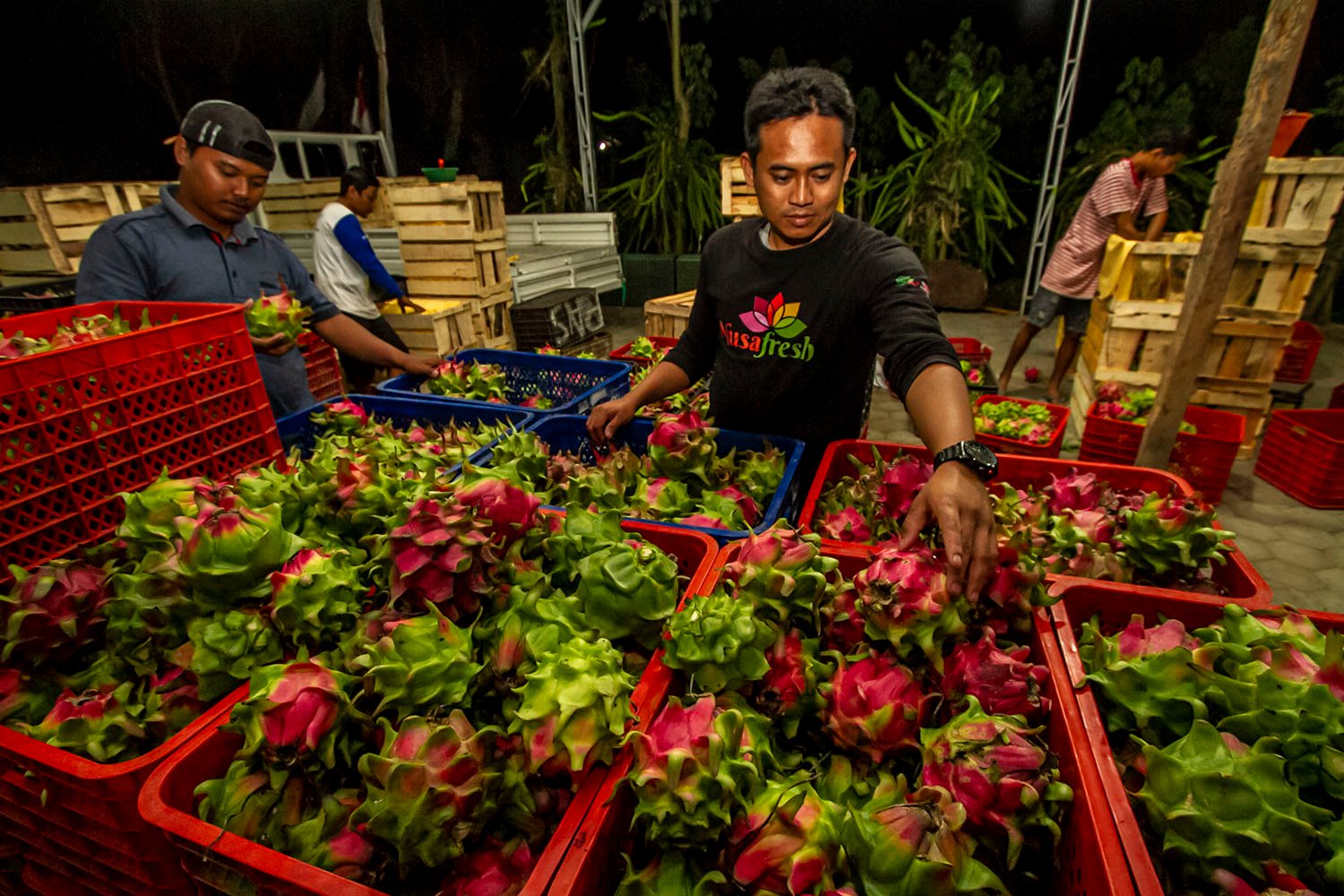 Petani Buah Naga binaan YDBA melakukan panen pada malam hari.