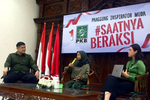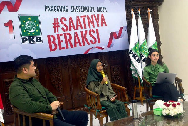 SinarHarapan.id – Aeshnina Azzahra Aqilani (tengah) Pelajar dari Gresik yang terkenal dengan aksinya untuk menjaga lingkungan bersama Jubir Millenial PKB Nada Fuady dan Mikhael Benyamin Sinaga menjadi pembicara pada diskusi “Saatnya Milenial Selamatkan Bumi” di kantor DPP PKB, Jakarta, Senin (6/2/2023). Salah satu aksi Aeshnina adalah menentang plastik sekali pakai serta menghentikan impor sampah ke Indonesia karena memiliki dampak buruk bagi generasi kini dan generasi masa depan. Foto SH/Elvis Sendouw