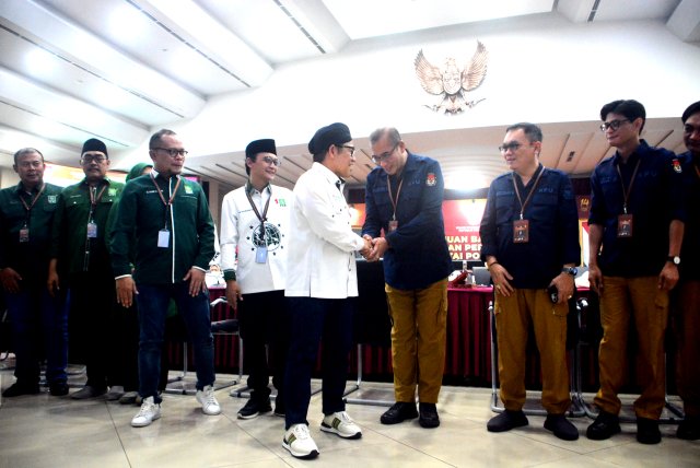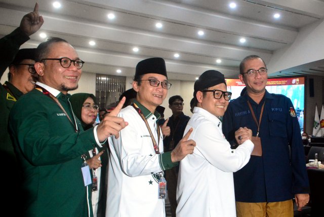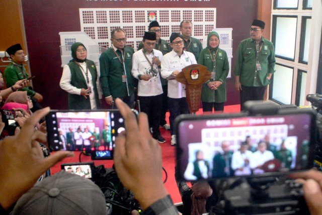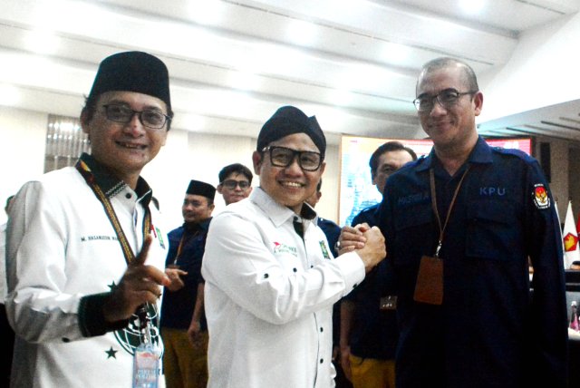 SinarHarapan.id – Ketua Umum Partai Kebangkitan Bangsa (PKB) Muhaimin Iskandar bersama kader datang berikan berkas bacalah ke Komisi Pemilihan Umum (KPU) RI, Jakarta, Sabtu (13/5/2023). KPU menerima berkas pendaftaran 580 bakal calon anggota DPR RI pada Pemilu 2024 dari PKB. Ketua Umum PKB Muhaimin Iskandar atau Cak Imin menyebut, partainya dari tingkat pusat hingga kota mendaftarkan bakal caleg PKB. Foto SH/Elvis Sendouw