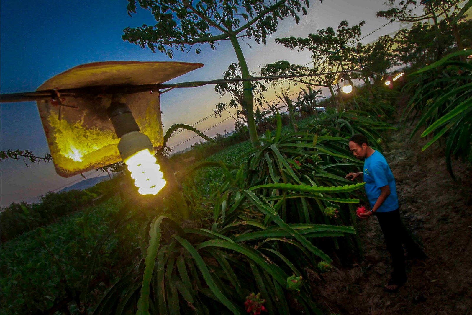 Dengan adanya pasokan listrik dari PLN, perkebunan buah naga di Banyuwangi kini dapat memanfaatkan sistem pencahayaan tambahan pada malam hari, yang sangat penting dalam mendukung pertumbuhan tanaman. Lampu-lampu ini membantu memperpanjang waktu fotosintesis buah naga, meningkatkan produktivitas, dan memastikan hasil panen yang lebih berkualitas. Foto: SHID/Ruht Semiono