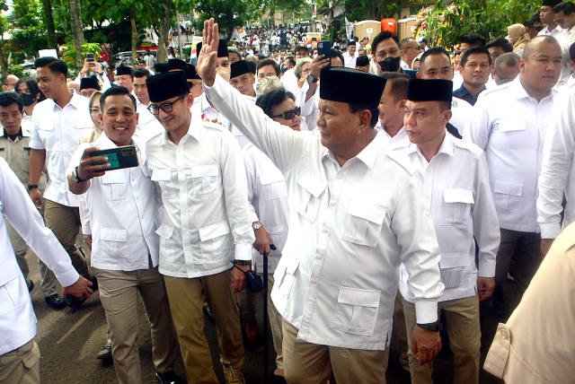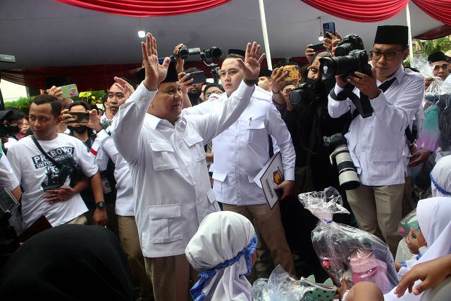 SinarHarapan.id – Ketua Umum Partai Gerindra Prabowo Subianto (tengah) menyapa warga saat menghadiri acara Hari Ulang Tahun (HUT) ke-15 Partai Gerindra di Kantor DPP Gerindra, Jakarta, Senin (6/2/2023). Dalam peringatan HUT ke -15 Partai Gerindra menggelar berbagai kegiatan yaitu donor darah, pengobatan gratis bagi warga sekitar serta memberikan santunan kepada anak yatim di halaman kantor DPP Partai Gerindra. Foto SH/Elvis Sendouw